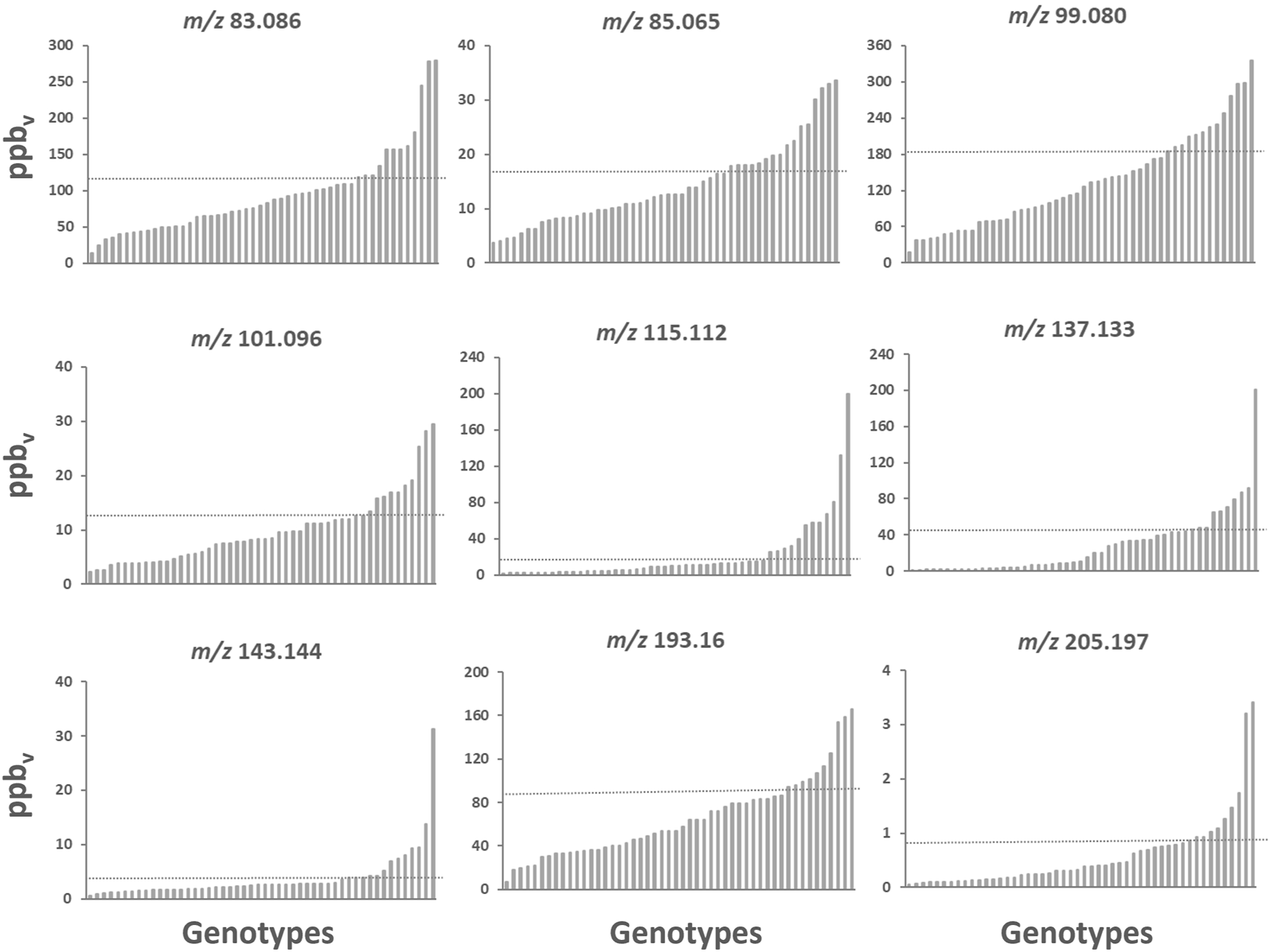 Bar chart plots of the main raspberry VOCs assessed by PTR-ToF-MS in the raspberry germplasm collection. Each bar illustrates the average value of three biological replicates. In each graph, accessions were ordered based on the VOC mass peak concentration. The 75th percentile levels are represented by the dashed line. Bar chart plots of all mass peaks with the corresponding complete names of the accessions are reported in the Supplementary Figure S6.