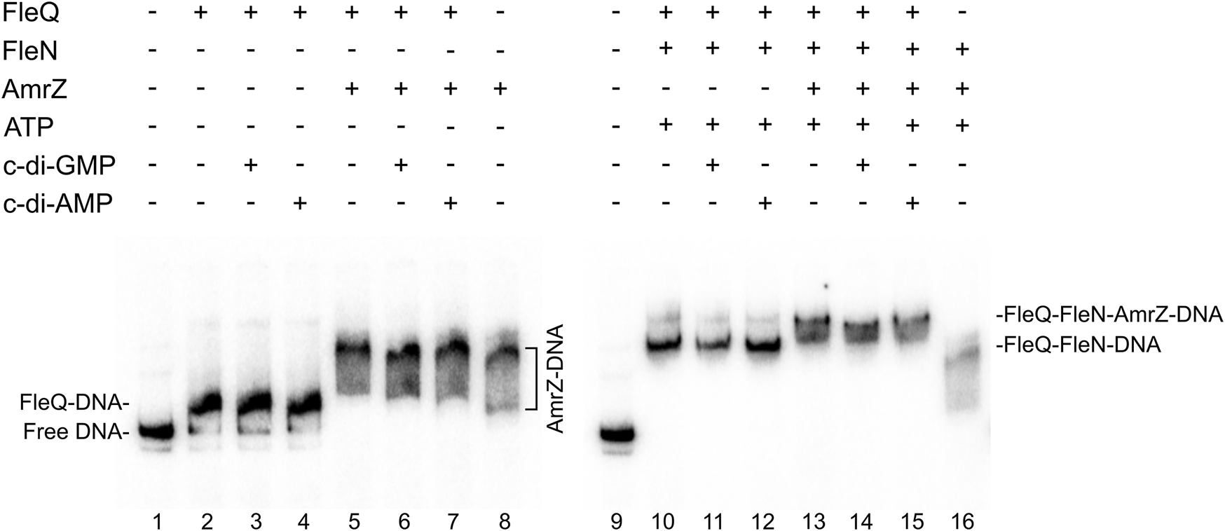 FIGURE 5. In vitro binding of the FleQ-FleN complex to the wss promoter region in the presence of AmrZ.Binding reactions were carried out in the absence (-) and in the presence (+) of FleQ, FleN, AmrZ and ATP, GTP, c-di-GMP or c-di-AMP. Putative shifted protein-DNA complexes are indicated.