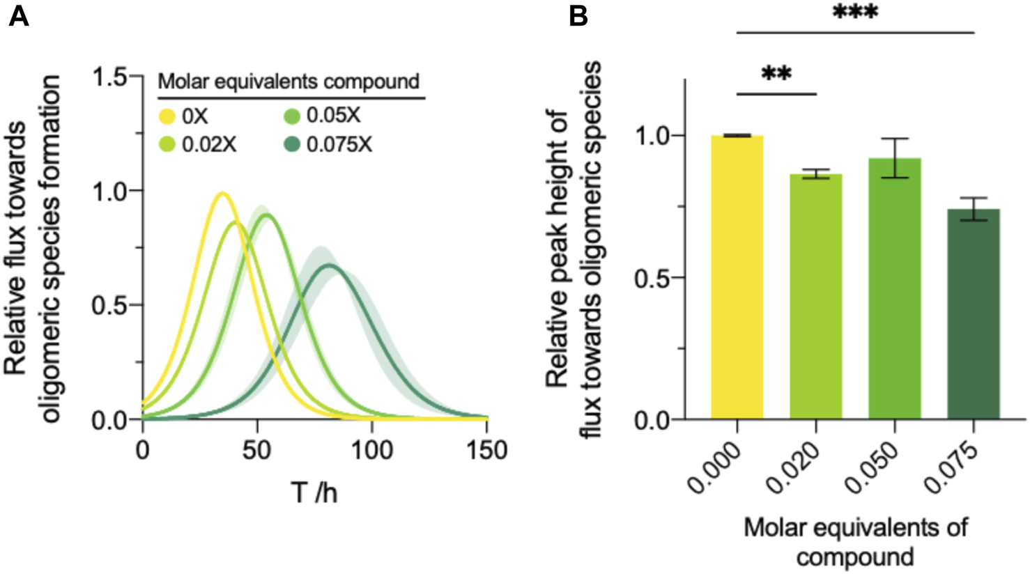To this end, we applied the extracted effective rate quantifications of both secondary nucleation and elongation to Eq. 7 to yield an approximation of the oligomeric flux over time (Staats et al., 2020). Compound 69.2 was able to delay the formation of oligomeric species significantly (Figure 5A). The compound was able to reduce the peak height of ϕ (Eq. 11) by ∼14% and ∼26% at 0.02 and 0.075 M equivalents relative to monomer, respectively (Figure 5B).