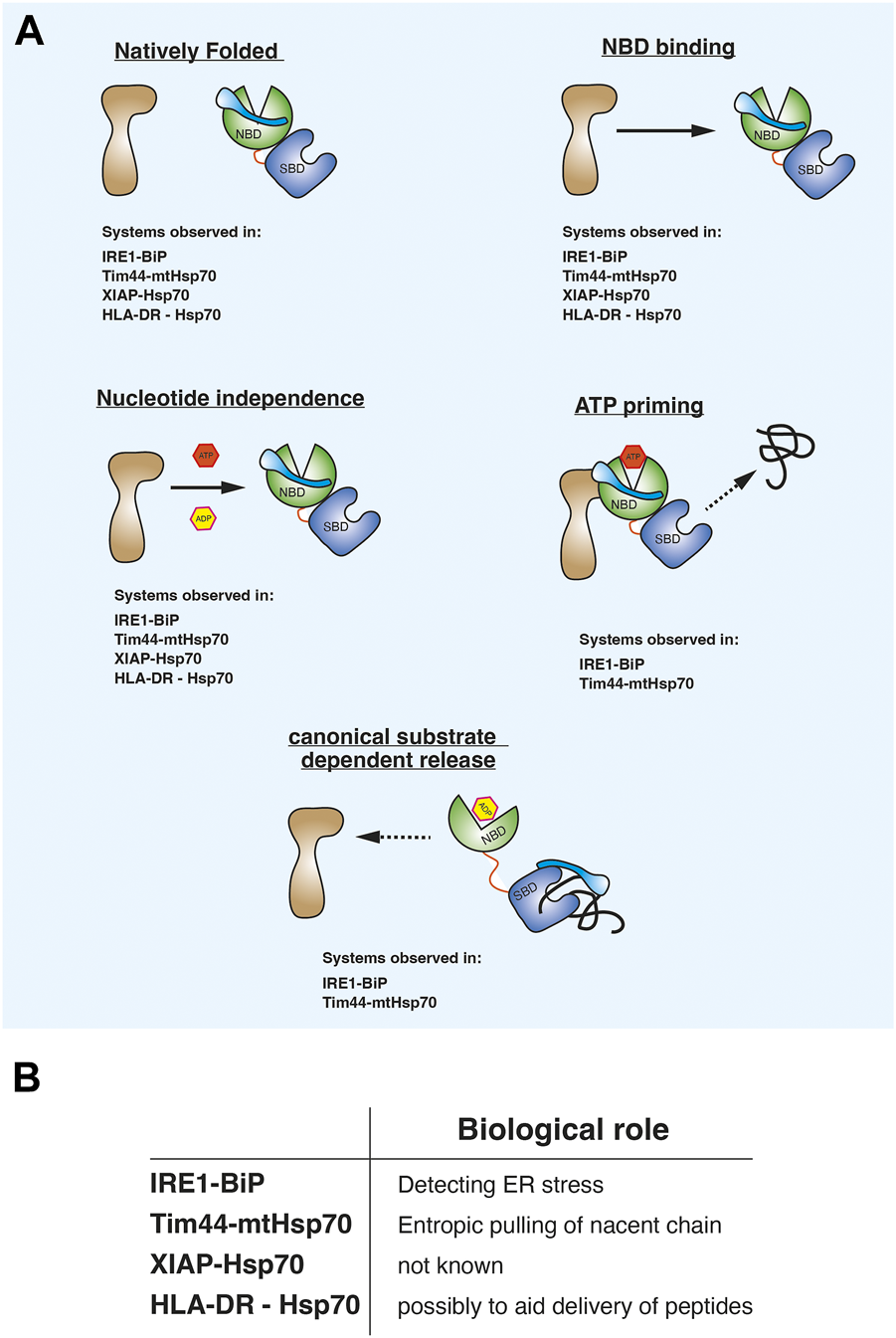 Evaluating the observations from the different biological systems suggests that there may be a consistent pattern in the way Hsp70 associates in this alternative binding mode. First, the non-canonical binding partner is in a native folded state and not misfolded, in an extended conformation, or in a non-native intermediate condition. Second, the non-canonical interaction is mediated predominately via the NBD domain. Third, the association between Hsp70 NBD and binding partner is unaffected by nucleotides. Fourth, ATP may prime the Hsp70-complex to interact with substrate. Fifth, misfolded substrate proteins or peptides bind to the canonical SBD which causes the release of the NBD mediated non-canonical interaction (Figure 2A). The last two points are observed with the ER and mitochondrial Hsp70 systems for which there is a biological rationale for providing an alternative binding mode. It is yet to be elucidated what the role of this binding is for the XIAP and HLA-DR, although for HLA-DR it has been suggested to possibly assist in the transfer of peptides during T-cell stimulation (Figure 2B). The common features comprise a distinct mechanism underpinning the ATPase domain interaction that differs from the classical substrate chaperone regulation and therefore referring to this type of interacting protein as a client protein can be unclear. Furthermore, these binding partners are not co-chaperones that accelerate Hsp70 ATPase activity via interactions with the NBD. To aid clarity, we refer to them as Hsp70 ATPase alternative binding proteins or HAAB proteins. HAAB consist of a group of Hsp70 binding proteins that enable Hsp70 to operate with the aforementioned mechanistic characteristics that differs from its canonical interaction with client proteins. Thus, different adapted Hsp70 systems may have common features that underlie how ATPase domain association enable the Hsp70 chaperones to operate in an alternative HAAB mechanism.