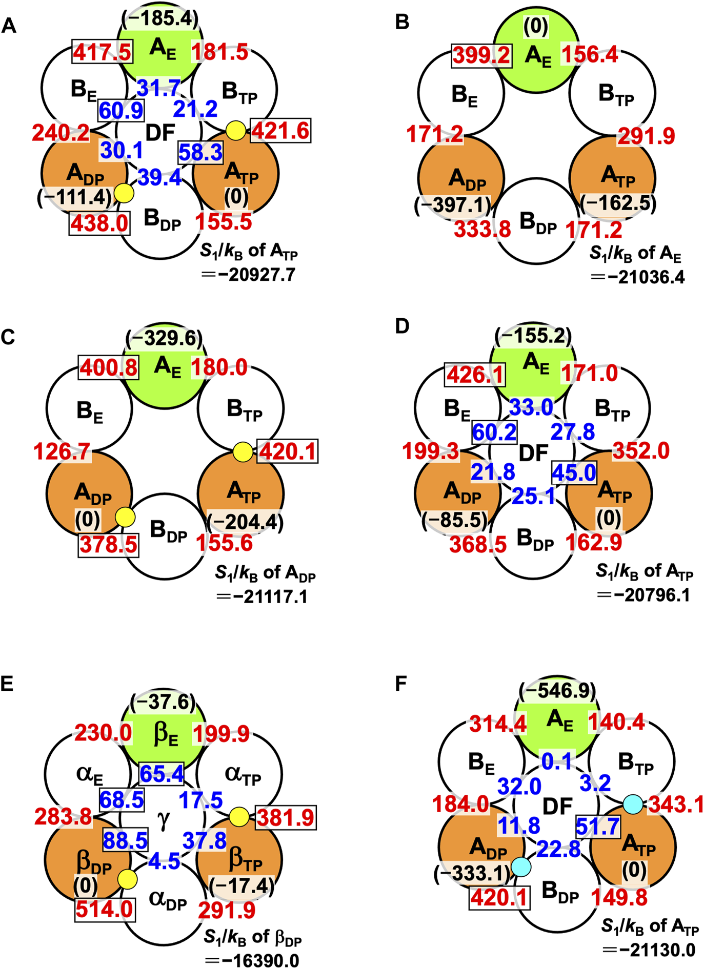 We analyze the PEs of ADP, ATP, and AE and those of the three subcomplexes. The key quantity is S1, and smaller | S1 | implies that the protein or subcomplex is more closely packed and its PE is higher. We use the crystal structures of the A3B3 complexes with no nucleotides bound and two AMP-PNPs bound (A3B3⋅2AMP-PNP) and those of the A3B3DF complexes with no nucleotides bound, two AMP-PNPs bound (A3B3DF⋅2AMP-PNP), and two ADPs bound (A3B3DF⋅2ADP). In A3B3⋅2AMP-PNP and A3B3DF⋅2AMP-PNP, AMP-PNP and Mg2+ are bound to ADP and ATP but nothing is bound to AE. In the calculation of S1, AMP-PNP is replaced by ATP. Since AE has fewer atoms than the other two A subunits, S1 of ATP-Mg2+ is added to S1 of any protein, protein pair, or protein complex including AE for impartial comparison among their PEs (i.e., Eqs 2a, 2b are adopted). A similar treatment is made for A3B3DF⋅2ADP. For all the crystal structures, the slight overlaps of the protein atoms are removed using a standard energy-minimization technique (Yoshidome et al., 2011).