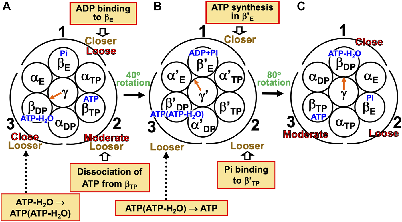 The three subcomplexes are named in respect of their positions. Hence, after the γ subunit rotates by 120° (Figure 3B), subcomplex 3, for instance, now comprises βE, αE, and αTP. βDP, βTP, and βE take closed, closed, and open structures, respectively: The backbone and side chains are more closely packed in βDP or βTP than in βE.