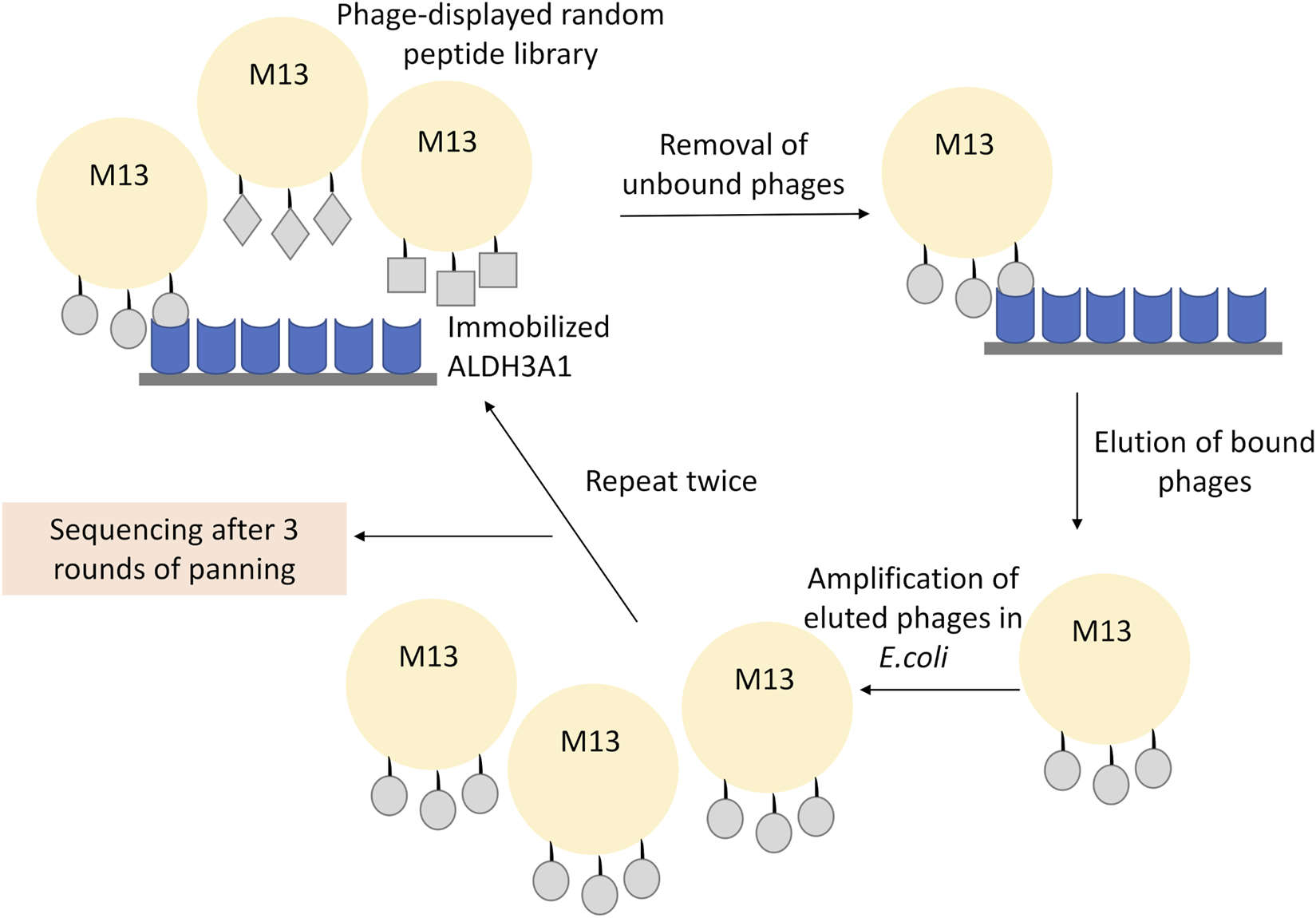 Representative scheme of the phage display experiment. The recombinant ALDH3A1 protein was immobilized at the surface of a plate and was subsequently incubated with the 12-mer peptide library displayed on the surface of the M13 phages. The unbound phages were removed through repetitive washes, while the bound phages were eluted under low pH conditions, amplified, and re-used into a new round of panning. To increase the specificity of the assay, three overall rounds of panning and amplification were conducted. Finally, the isolated phages from the last round were isolated and sequenced.