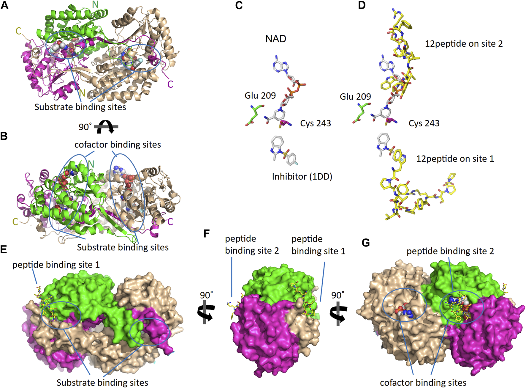 The 3D structure of ALDH3A1 dimer (PDB id 4L2O) and the predicted peptide (P1) binding sites on the protein. One monomer of the protein is wheat while the other is two-colored to indicate the catalytic (green) and the cofactor/NAD (magenta) binding domains. (A,B) The protein structure is shown in cartoon representation. The bound inhibitor and NAD molecules are indicated with space-filling models. Panels A and B show two different views of the molecule after a 90° rotation around the indicated axis. (C) The active site of one monomer. The catalytic residues Cys 243 and Glu 209 are indicated. On the substrate and cofactor binding sites are present the inhibitor 1DD (1-[(4-fluorophenyl) sulfonyl]-2-methyl-1H-benzimidazole) and the cofactor NAD (nicotinamide-adenine dinucleotide) (sticks representation). (D) The best HPEPDOCK solutions, for P1 binding on Sites 1 and 2, are indicated by the superposition of the peptide models (yellow sticks) on the inhibitor and cofactor molecules (gray sticks), respectively. (E–G) The protein structure is shown in surface representation. Docked on the protein’s surface are indicated with yellow sticks the peptide models used in panel (D).