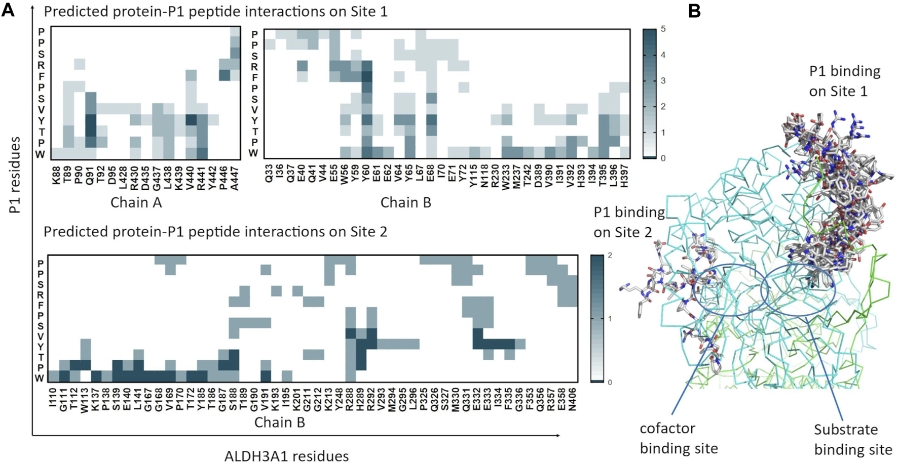 Predicted P1 conformations bound on ALDH3A1. (A) Heatmaps highlight the protein/peptide residues found in close proximity (less than 5.5 Å apart) at the predicted complexes. The five top solutions on Site 1 (upper panel) and the two solutions on Site 2 (lower panel) were used for the diagrams. (B) Superposition of the predicted P1 conformations bound on the ALDH3A1 Site 1 (15 models) and Site 2 (2 models). The protein chains are represented by green and cyan ribbons. The peptide models are shown as sticks (gray for carbon, red for oxygen, and blue for nitrogen atoms).