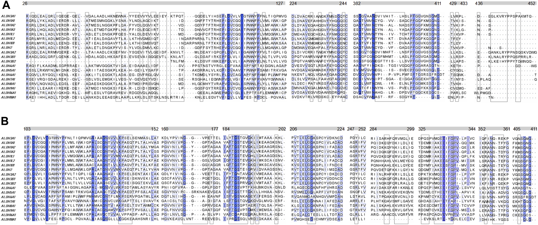 The sequences of all the hALDH superfamily members were aligned using the Τ-Coffee algorithm (http://tcoffee.crg.cat/apps/tcoffee/do:regular) (Notredame et al., 2000). The results of the alignment were viewed on the Jalview software (Waterhouse et al., 2009) to identify the conserved regions within sequences.