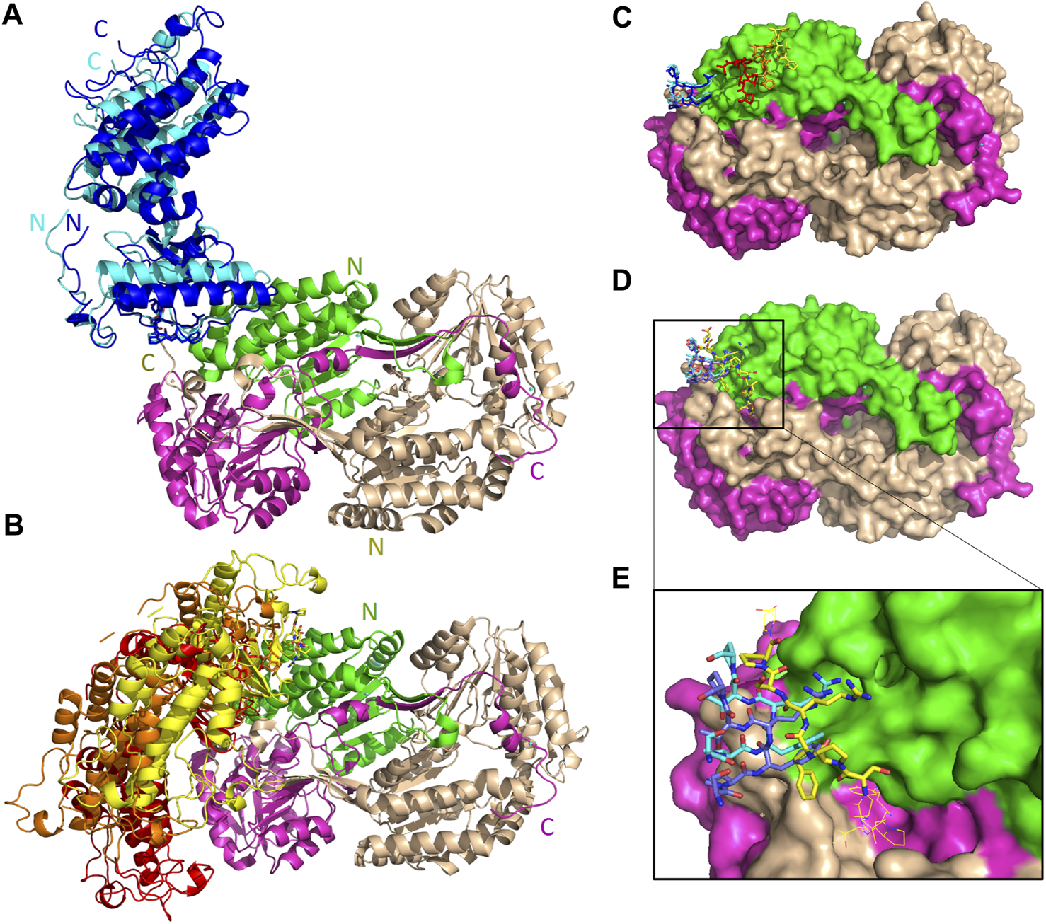The predicted peptide (P1) conformations bound on the ALDH3A1 surface. Each protein monomer is colored differently, i.e., green and cyan. HPEPDOCK solutions are indicated by dark magenta ribbons and CABS-dock solutions by purple. (A,B) Site 1 (15 models). (C) Site 2 (2 models).