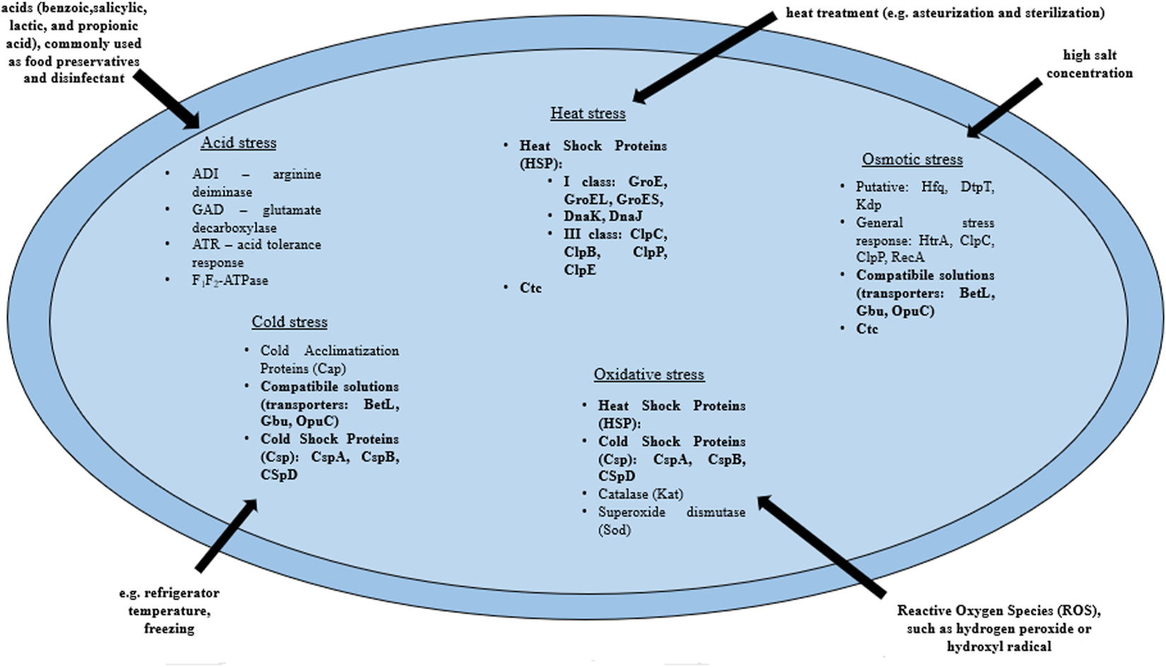 | Heat stress (HSP—heat shock protein) | I class HSP: groE, dnaK, dnaJ, groEL and groES | GroE, DnaK, DnaJ, GroEL, GroES (chaperones) | Bucur et al. (2018) | |