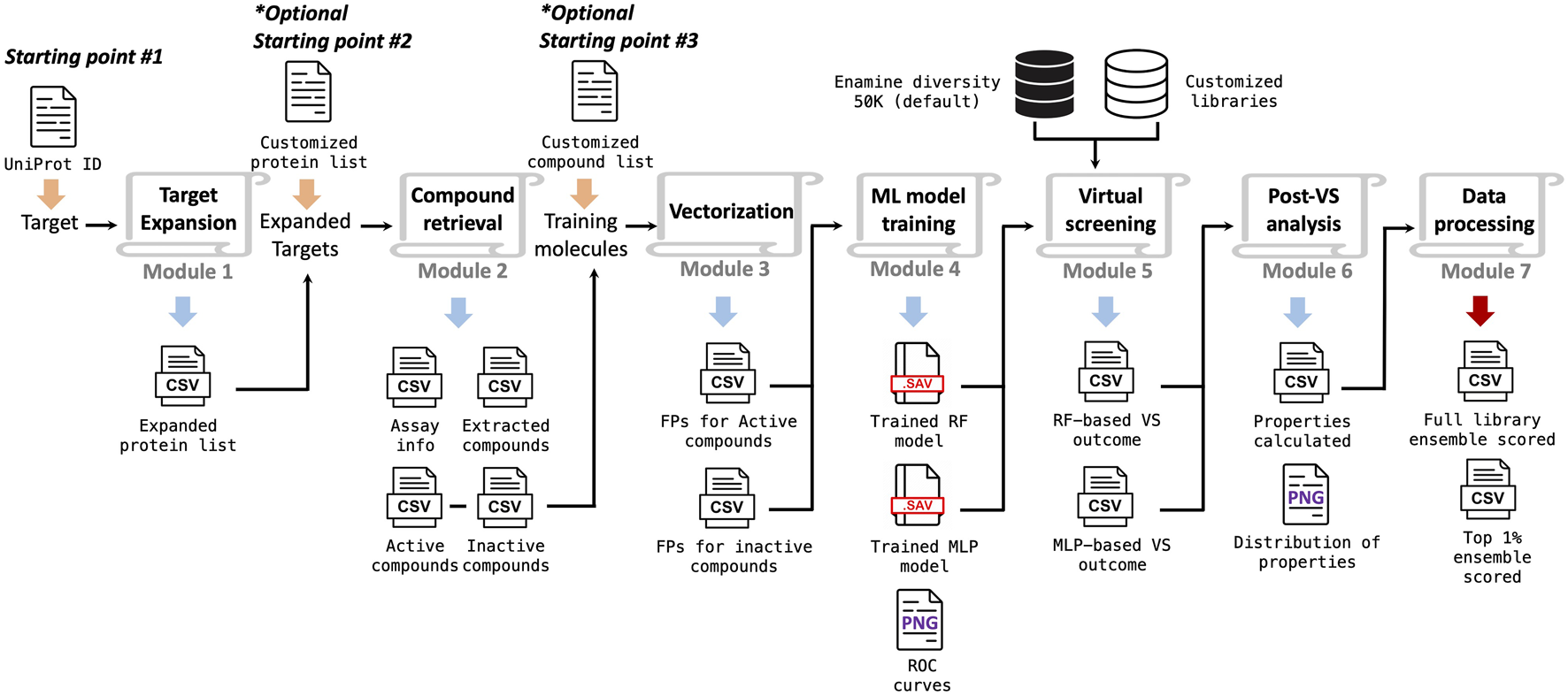 The overall implementation of the TAME-VS is illustrated in Figure 1. There are three alternative starting points and seven modules in sequence. With only the UniProt ID of the target of interest as the input, the workflow can be initiated from Starting Point #1. The first module, Target Expansion, performs a global protein sequence homology search through the Basic Local Alignment Search Tool (BLAST) (Altschul et al., 1990) and expands the target list by identifying proteins with high sequence similarities within categorical protein family members. The second module, Compound Retrieval, extracts corresponding compounds with activity against the proteins in the target list by querying the ChEMBL database. The extracted compounds are grouped into active and inactive ligands according to assay types and activity cutoffs. The descriptive features of extracted compounds are subsequently converted to chemical fingerprints in the third module, Vectorization. The fourth module, ML Model Training, trains supervised ML classification models, by default, random forest (RF) and multilayer perceptron (MLP), based on the calculated fingerprints. In the fifth module, Virtual Screening, the trained machine learning models are applied to screen user-defined compound collections. By default, an Enamine diversity 50K library is screened, and compounds are ranked according to the prediction scores. Module 6, Post-VS Analysis, evaluates quantitative drug-likeness (QED) and calculates key physical–chemical properties for screened compounds. Finally, module 7, Data Processing, encapsulates all the data and presents the virtual hits in addition to the evaluation outcome of the entire chemical library in a summary report. Users can also initiate the workflow with their own customized target lists (pre-selected positive targets based on biological rationale) or compound lists (pre-selected active and inactive compounds) from Starting Point #2 and Starting Point #3, respectively. In addition, each module can be used individually, and the output of each module is exported to the corresponding folders for users to review.