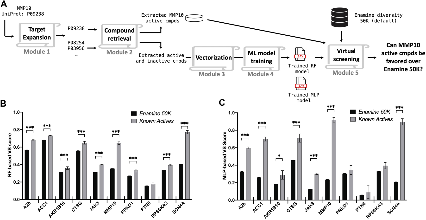 Retrospective validations across ten different protein targets. (A) Schematic illustration of a retrospective study. Averaged VS scores reported by the RF model (B) and the MLP model (C) for the entire Enamine diversity 50K library (black bar) and known active compounds (gray bar) of the query target. The error bar represents the standard error of the mean (SEM), *p < 0.05; **p < 0.01; ***p < 0.001.