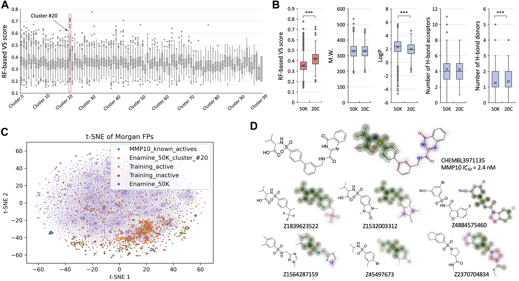 Structural insights revealed from the screening. (A). Box and Whisker plots for RF-based VS scores across structurally clustered groups of Enamine 50K library. (B). Comparison of VS scores and properties between cluster #20 and the remaining part of the Enamine 50K library. (C). t-SNE analysis to visualize covered chemical spaces by known MMP10 actives (blue), cluster #20 (orange), active molecules in the training set (green), inactive molecules in the training set (red), and full Enamine 50K compounds (purple). (D). One known MMP10 inhibitor and exemplified compounds in cluster #20. The overlapping benzenesulfonamide group is highlighted in green. Dissimilar moieties are colored pink.
