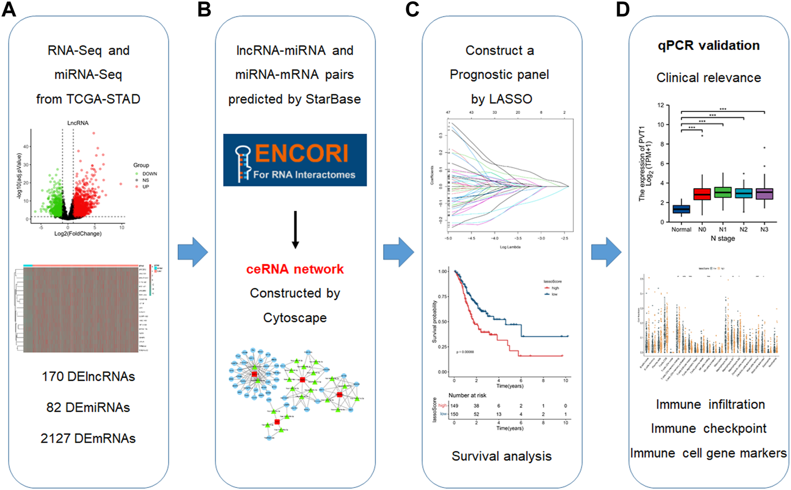 Results: Four DElncRNAs, 21 DEmiRNAs and 45 DEmRNAs were included in the ceRNA network. A 3-element panel (comprising lncRNA PVT1, hsa-miR-130a-3p and RECK) with poor overall survival (OS) was established and qPCR was applied to validate the expressions of hub RNAs. Hub RNAs were firmly associated with T, M, and N stage. The CIBERSORT database showed that the high lassoScore group exhibited a significantly high ratio of resting memory CD4+ T cells, M2 macrophages and a significantly low ratio of activated memory CD4+ T cells and M1 macrophages. According to the TIMER database, this panel was linked to immune infiltrations and immune cell gene markers. TISIDB database indicated that RECK was positively correlated with immune checkpoints (including CD160, CD244, PDCD1, and TGFBR1).