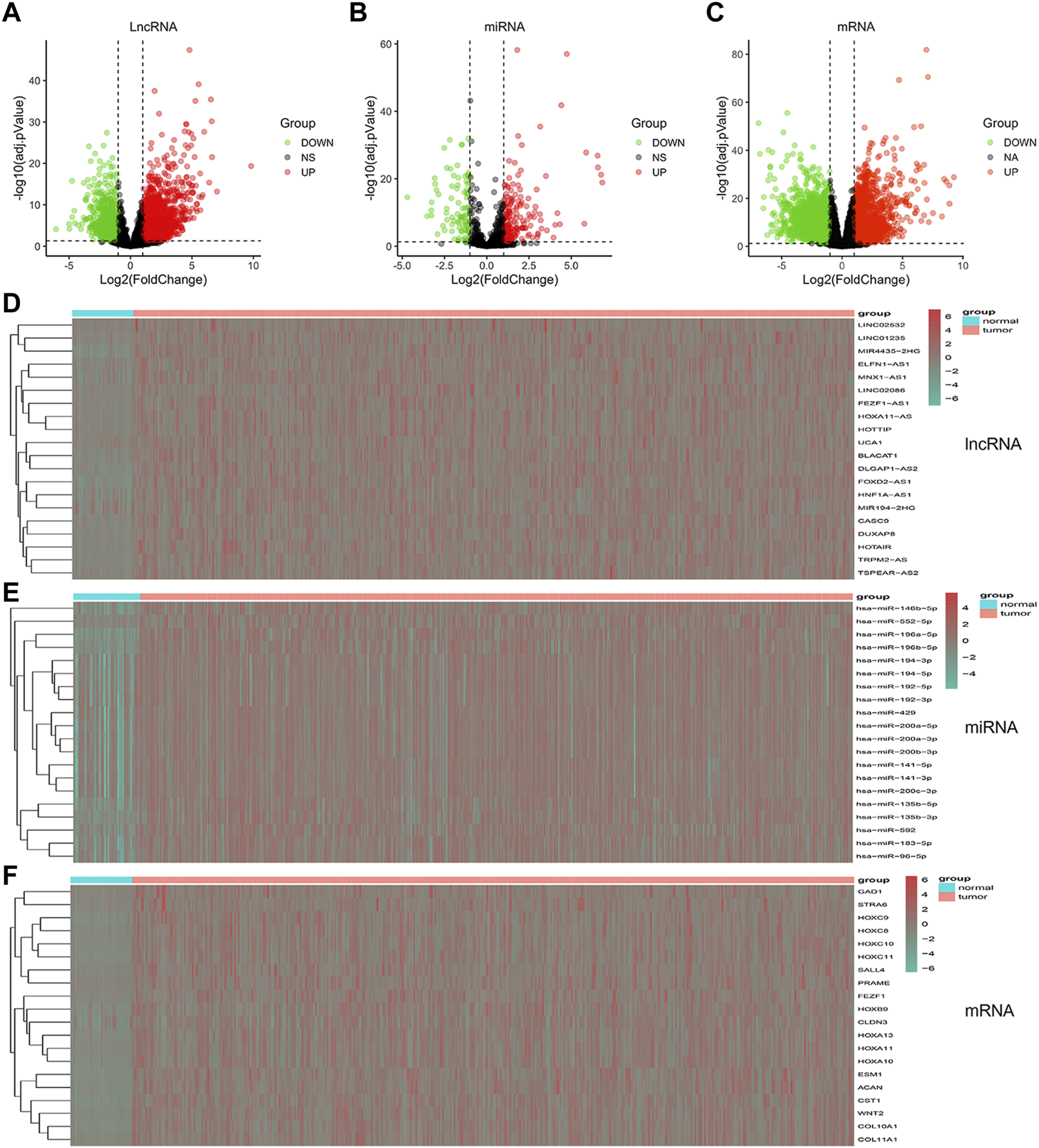 Volcano plots and heatmaps plots of hub RNAs involved in the prognostic panel. (A–C) Volcano plots showed DElncRNAs, DEmiRNAs, and DEmRNAs (FoldChange >2 and p < 0.01). (D–F) Heatmaps showed the top 20 DElncRNAs, DEmiRNAs, and DEmRNAs.