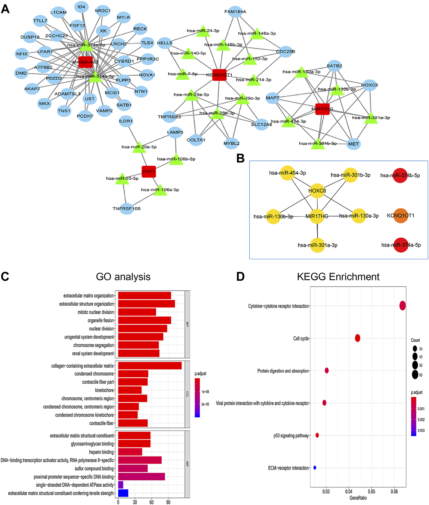 The hub elements of the GC regulating ceRNA network were identified using the CytoHubba plug-in in Cytoscape. One lncRNA (MIR17HG), seven miRNAs and two mRNAs (HOXC8 and KCNQ1OT1) were identified (Figure 3B). GO analysis was employed to assess the functions of the DEmRNAs. Biological process (BP) enrichment indicated that the DEmRNAs were particularly enriched in the extracellular matrix organization, cellular component (CC) enriched in the collagen−containing extracellular matrix, the extracellular matrix organization along with MF enriched in extracellular matrix structural constituent (Figure 3C). According to KEGG analysis, the DEmRNAs were connected to cytokine‒cytokine receptor interactions, the cell cycle function, protein digestion and absorption, viral protein interactions with cytokines and cytokine receptors, ECM-receptor interactions and the p53 signaling pathway (Figure 3D).