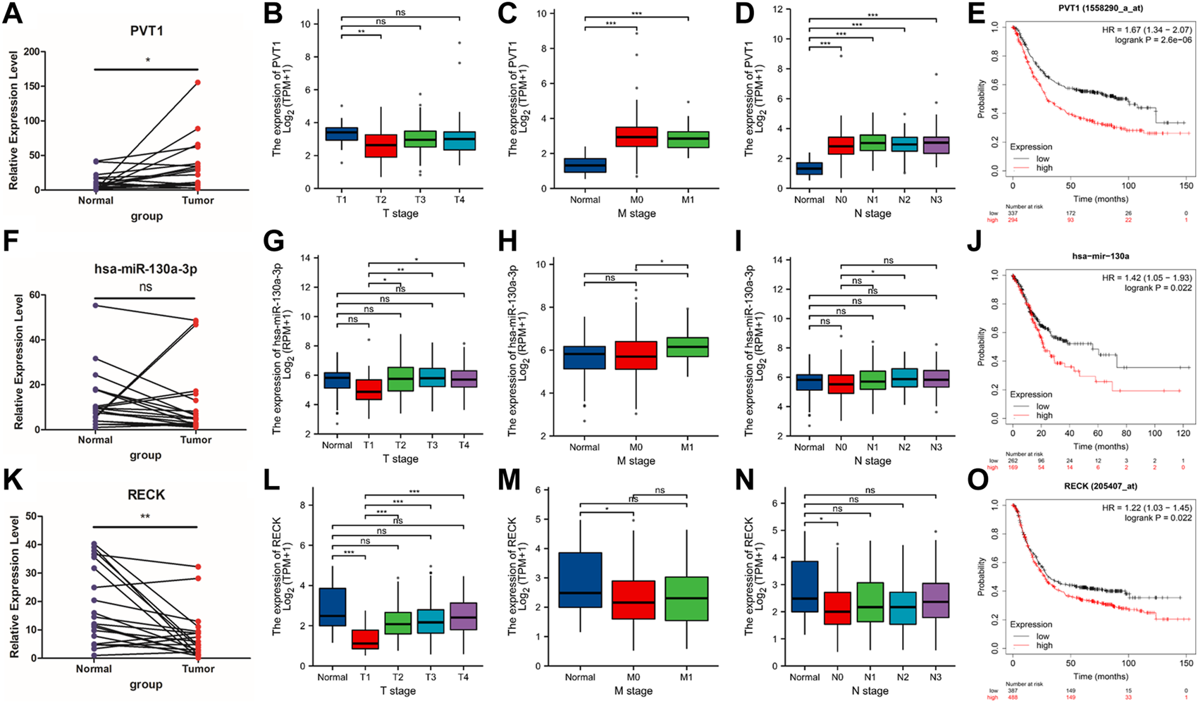 qPCR validation and clinicopathological parameters of PVT1, hsa-miR-130a-3p and RECK. (A,F,K) The expression of PVT1, hsa-miR-130a-3p and RECK between the tumor group and the normal group (B–D); (G–I); (L–N). (E) KM plot was utilized to describe the OS in the high or low PVT expression groups. (J) KM plot was used to show the OS in the high or low hsa-mir-130a expression groups. (O) KM plot was applied to present the OS in the high or low RECK expression groups.