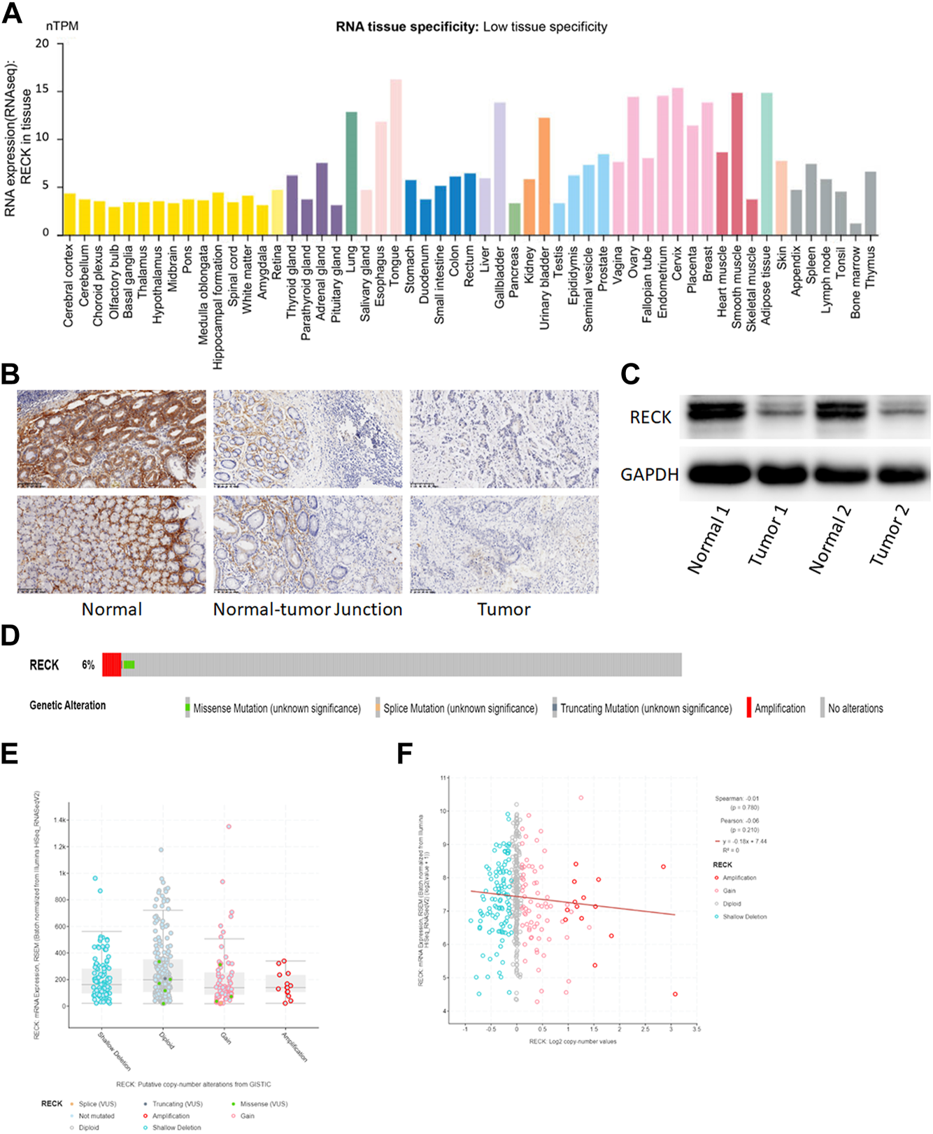 The expression of RECK in GC tissue and the OS rate was studied in the KM plot. The OncoPrint diagram of cBioPortal (http://www.cbioportal.org/) shows the distribution of RECK genomic alterations. The relationship between RECK copy number and the mRNA expression level was evaluated by cBioPortal.