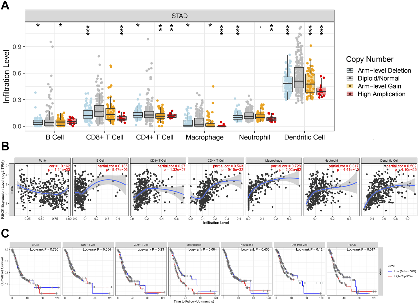 To reveal the association between RECK expression and immune infiltrations, the TIMER database (https://cistrome.shinyapps.io/timer/) was utilized (Li et al., 2020a). The TIMER database is utilized to evaluate the relationship between RECK and immune cell infiltrations (such as T cells, macrophages and B cells et al.), the RECK copy number in GC and their prognostic value. The HPA database was exploited to show RECK expression in different kinds of PBMCs (Uhlen et al., 2019).