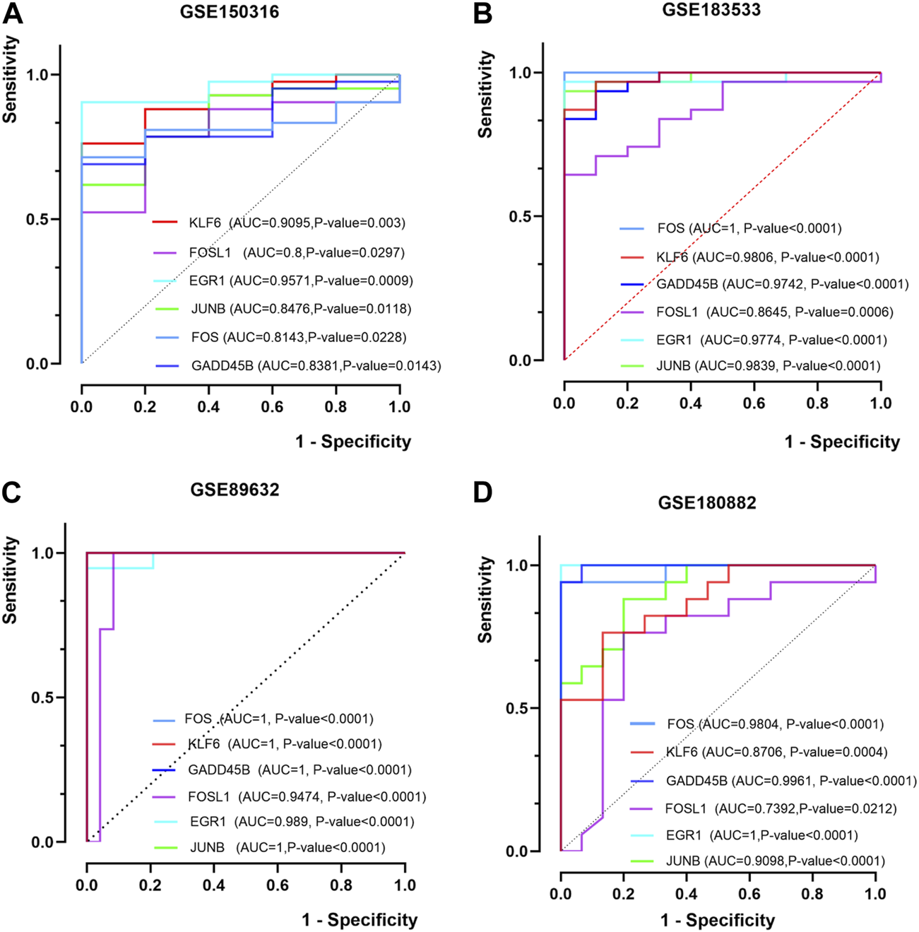 The ROC of six hub genes in the datasets (GSE183553, GSE89632, GSE89632, and GSE180882) were drawn to evaluate the prediction accuracy of hub genes. In the four datasets, the area under the curve (AUC) values of five hub genes were more than 0.8 (Figures 5A–D). It was proved that FOS, JUNB, EGR1, KLF6, FOSL1, and GADD45B showed favorable diagnostic value. These results demonstrated the potential of the aforementioned hub genes as biomarkers for the diagnosis of NASH and COVID-19.
