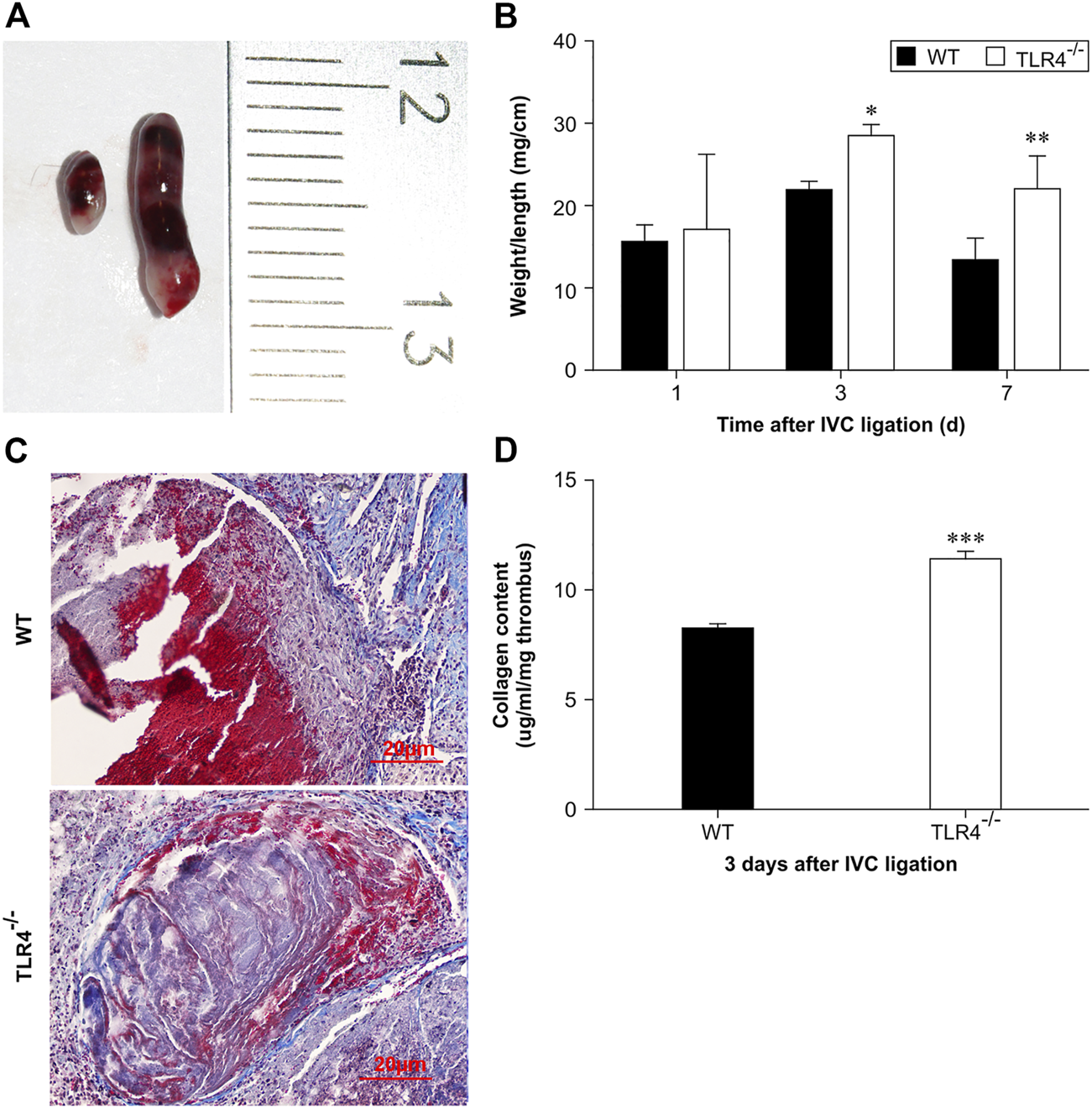 Stasis-induced deep vein thrombus in WT and Tlr4−/− mice. (A) Macroscopic appearance of intravenous thrombi in WT (left) and Tlr4−/− mice (right) 3 days after the IVC ligation. Representative results from 6 independent animals are shown. (B) The thrombus weight-to-length ratios of WT and Tlr4−/− mice at the indicated time intervals after IVC ligation. Data are mean ± SD (n = 6). *p < 0.05, **p < 0.01, Tlr4−/− versus WT. (C) Masson staining showed the distribution of collagen in the venous thrombus in WT and Tlr4−/− mice at 3 days after IVC ligation (scale bar = 20 µm). (D) Intrathrombotic collagen content in WT and Tlr4−/− mice at 3 days after IVC ligation. Data represent mean ± SD (n = 6). ***p < 0.001, Tlr4−/− versus WT.