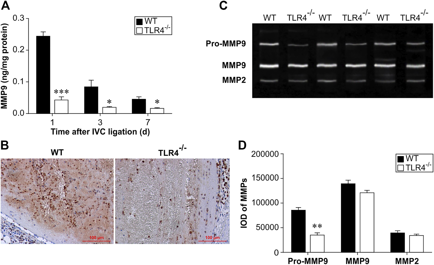 DVT resolution is similar to wound healing processes which involve collagen and MMP. MMP production and activity can be regulated at various levels, including gene transcription, endogenous repression, and pro-MMP activation (Hobeika et al., 2007). MMPs are an inactive precursor generated in cells, secreted extracellularly to be activated. Enhanced MMP-9 gene expression and activity accelerated DVT resolution in later phase in IFN-γ−/− mice (Nosaka et al., 2011). A study performed in neutropenic rats suggested that a decrease in intrathrombus MMP-9 gelatinase activity is related to impairment of DVT resolution in early phase (Henke et al., 2006). Here, we showed that TLR4-deficient mice had significantly lower levels of MMP-9 expression than TLR4-intact mice at 1, 3, and 7 days after IVC ligation. Lower gelatinase activity of pro-MMP-9 in TLR4-deficient mice than mice with TLR4-intact. As a result, deletion of TLR4 seems to make it more difficult to remove thrombi through decreasing MMP-9 production and activity.