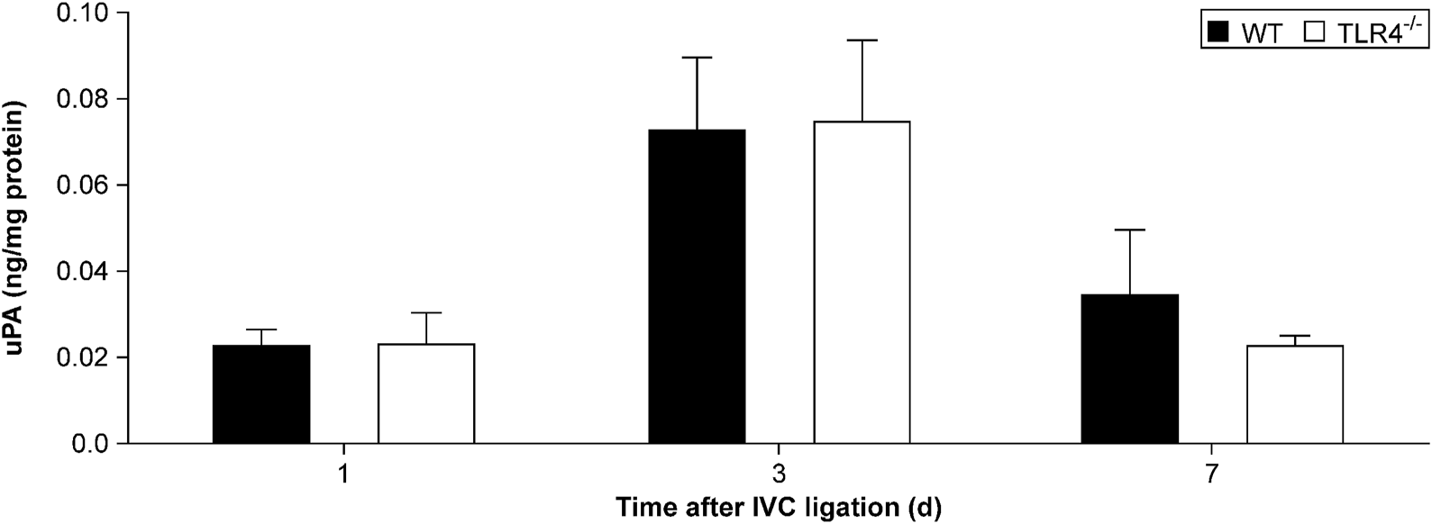 Urokinase plasminogen activator (uPA) protein expression in the thrombus measured by ELISA. There was no significant difference in uPA protein expression between Tlr4−/− mice and WT controls at all time points (1, 3, and 7 days) after IVC ligation.
