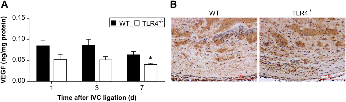 VEGF protein expression in the thrombus. (A) VEGF protein expression in the thrombus was measured by ELISA at 3 time points (1, 3, and 7 days after IVC ligation) in WT and Tlr4−/− mice. All values represent the mean ± SD (n = 6). *p < 0.05, Tlr4−/− versus WT. (B) Immunohistochemical analysis of VEGF in the thrombus at 3 days after IVC ligation (scale bar = 100 µm).