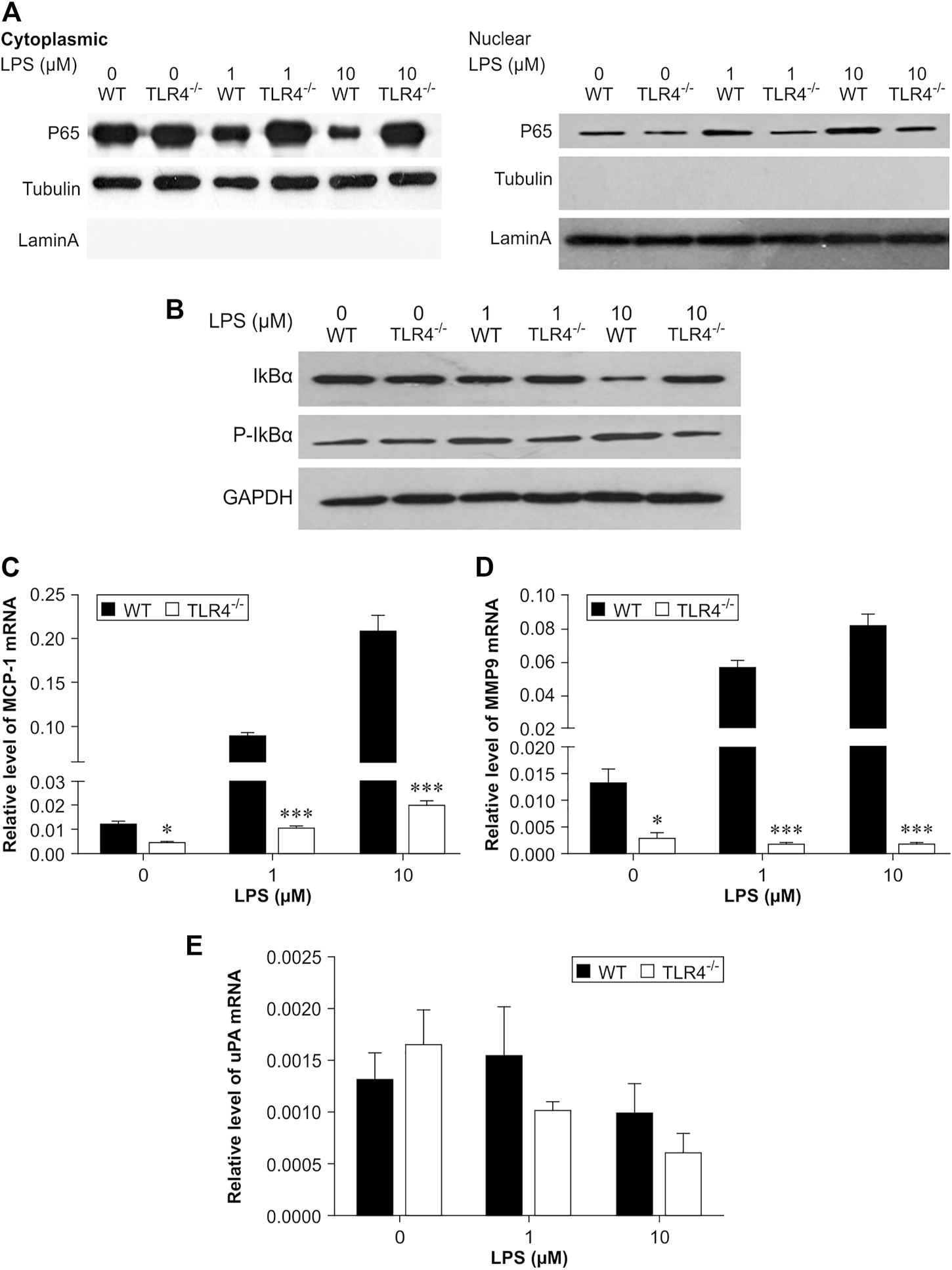 Critical role of NF-κB in lipopolysaccharide (LPS)-induced transcription of MCP-1 and MMP-9 in peritoneal macrophages. (A,B) Representative results of western blot analysis for p65 (A) protein levels and phosphorylation of IκBα (B). Quantitative results of p65, IκBα, and phosphorylation of IκBα protein levels, which were normalized to the internal control tubulin, lamin A, or GAPDH. (C–E)MCP-1(C), MMP-9(D), and uPA(E) mRNA expression measured by real-time PCR. The results were normalized to the number of β-actin transcript copies. Data represent mean ± SD (n = 3), *p < 0.05, **p < 0.01, ***p < 0.001, Tlr4−/− versus WT.
