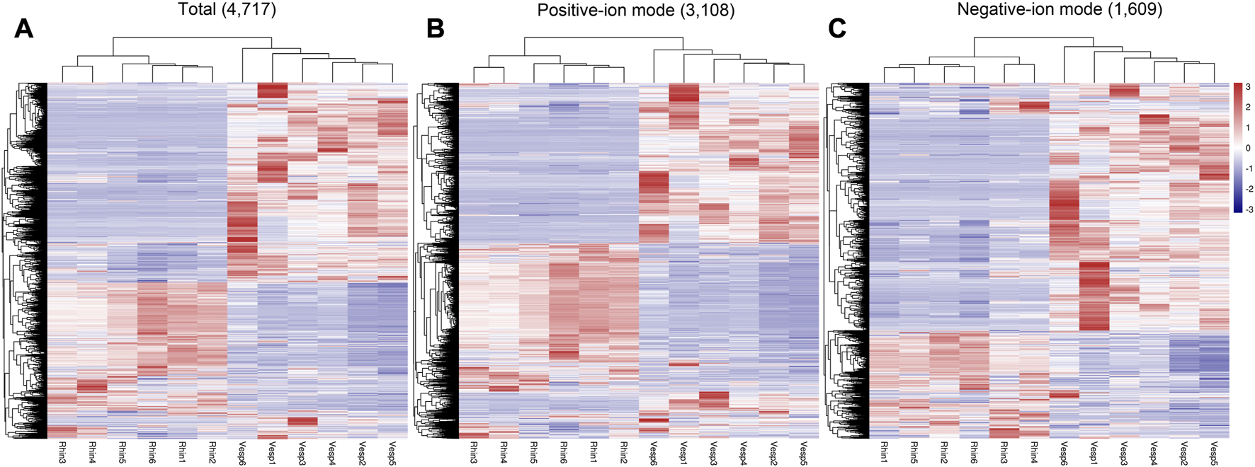 FIGURE 2. Heatmaps of the 4,717 annotated metabolites identified in the cochlea of R. sinicus and V. sinensis. (A) Total ions, (B) Positive ion mode, (C) Negative ion mode. Rhin and Vesp stand R. sinicus and V. sinensis, respectively, as also used elsewhere in this paper.