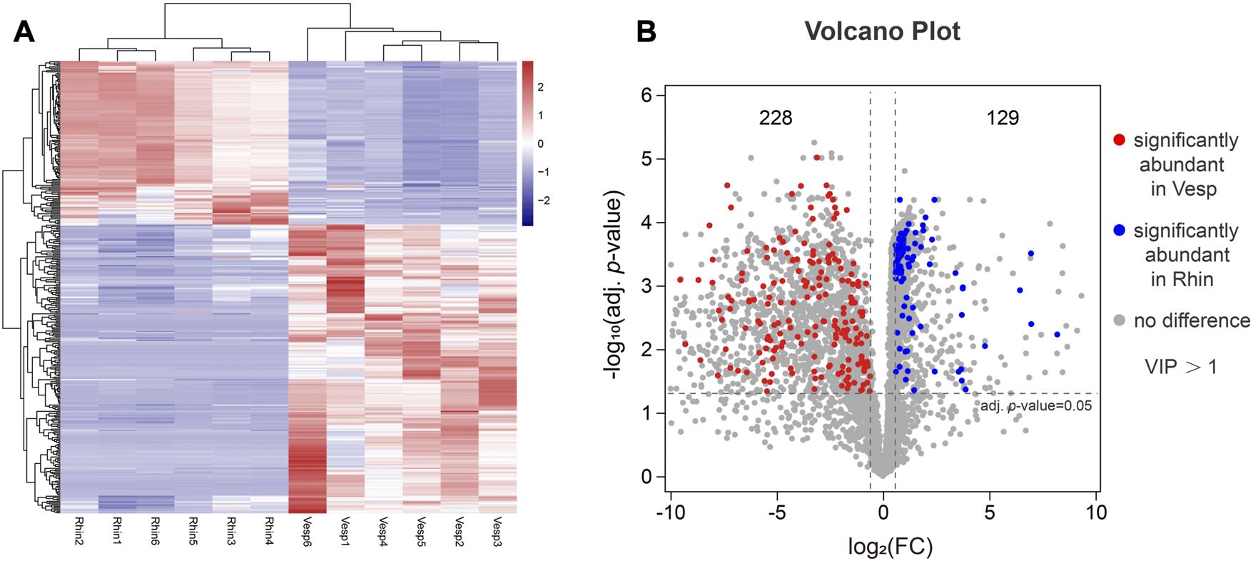 FIGURE 5. Visualization of DAMs present at significantly different levels in R. sinicus and V. sinensis. (A) Heatmaps of DAMs with the abundance levels in all cochlear samples. Red indicates an increase, blue indicates a decrease, rows indicate different metabolites, and columns indicate different samples. (B) Volcano plot of DAMs.