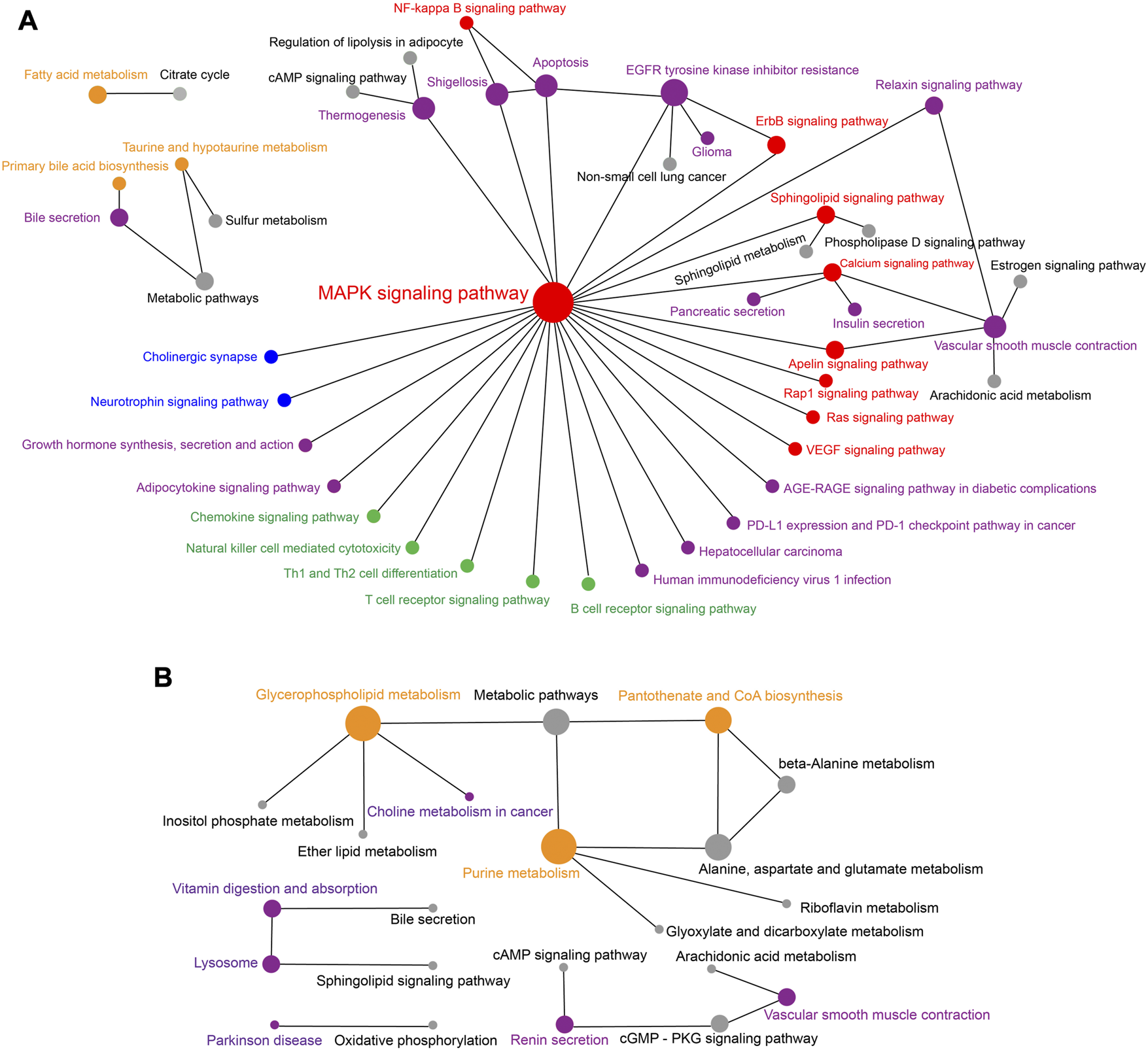 Furthermore, network analysis for significantly enriched KEGG pathways was performed to obtain insights into the relationships of the metabolites differently accumulated in R. sinicus and V. sinensis. The network for R. sinicus as shown in Figure 7A indicated that the MAPK signaling pathway (ko04010) was the most important core pathway, which communicated with multiple other signaling pathways, such as the NF-kappa B signaling pathway (ko04064) and Calcium signaling pathway (ko04020). At the same time, it also connected with various biological systems, such as Nervous system, Immune system, and Endocrine system. Meanwhile, specific metabolism-related pathways were potentially more active in the cochlea of V. sinensis, as revealed by the network analysis of significantly enriched KEGG pathways (Figure 7B), including Glycerophospholipid metabolism (ko00564), Pantothenate and CoA biosynthesis (ko00770), and Purine metabolism (ko00230), which closely interacted with each other.