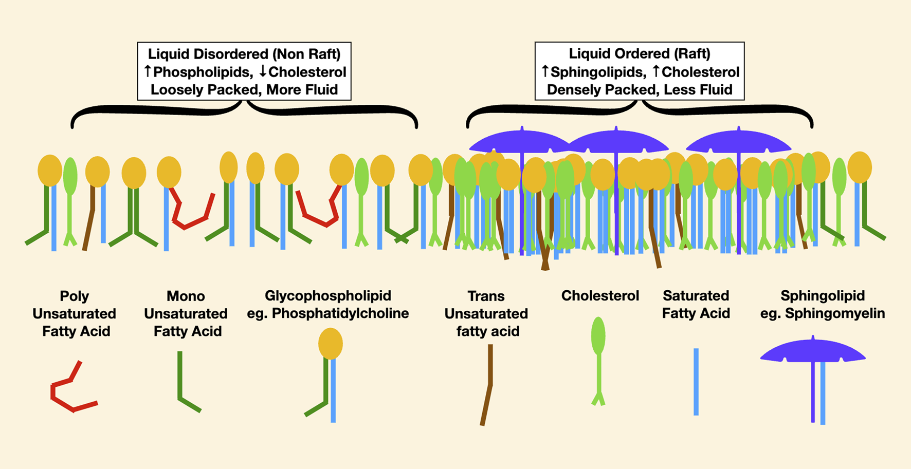 Compared to their cis analogs, TUFAs require eight times as much cholesterol to be incorporated into a cell membrane (Niu et al., 2005; Oteng et al., 2019). TUFAs may bind to either sphingolipids or phospholipids but tend to associate in rafts due to their high cholesterol affinity, thereby increasing raft formation.