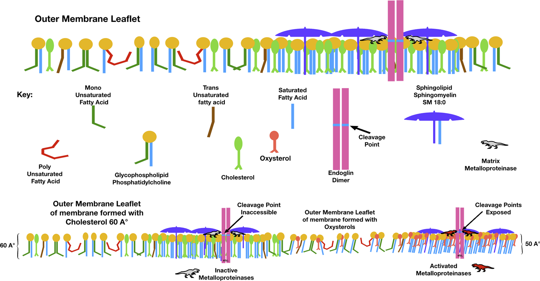 Compared to membranes formed with cholesterol, those with oxysterols are thinner and have lower lateral pressure. This figure illustrates a possible mechanism by which the elevated membrane oxysterols in preeclampsia create soluble endoglin, which, when released into the maternal circulation, binds with TGF-β and blocks its action. The point where matrix metalloproteinase-14 cleaves endoglin to release its extra-membranous soluble portion is normally sequestered within the hydrophobic plasma membrane. With high levels of oxysterols and thinner membranes, this cleavage point may be exposed.