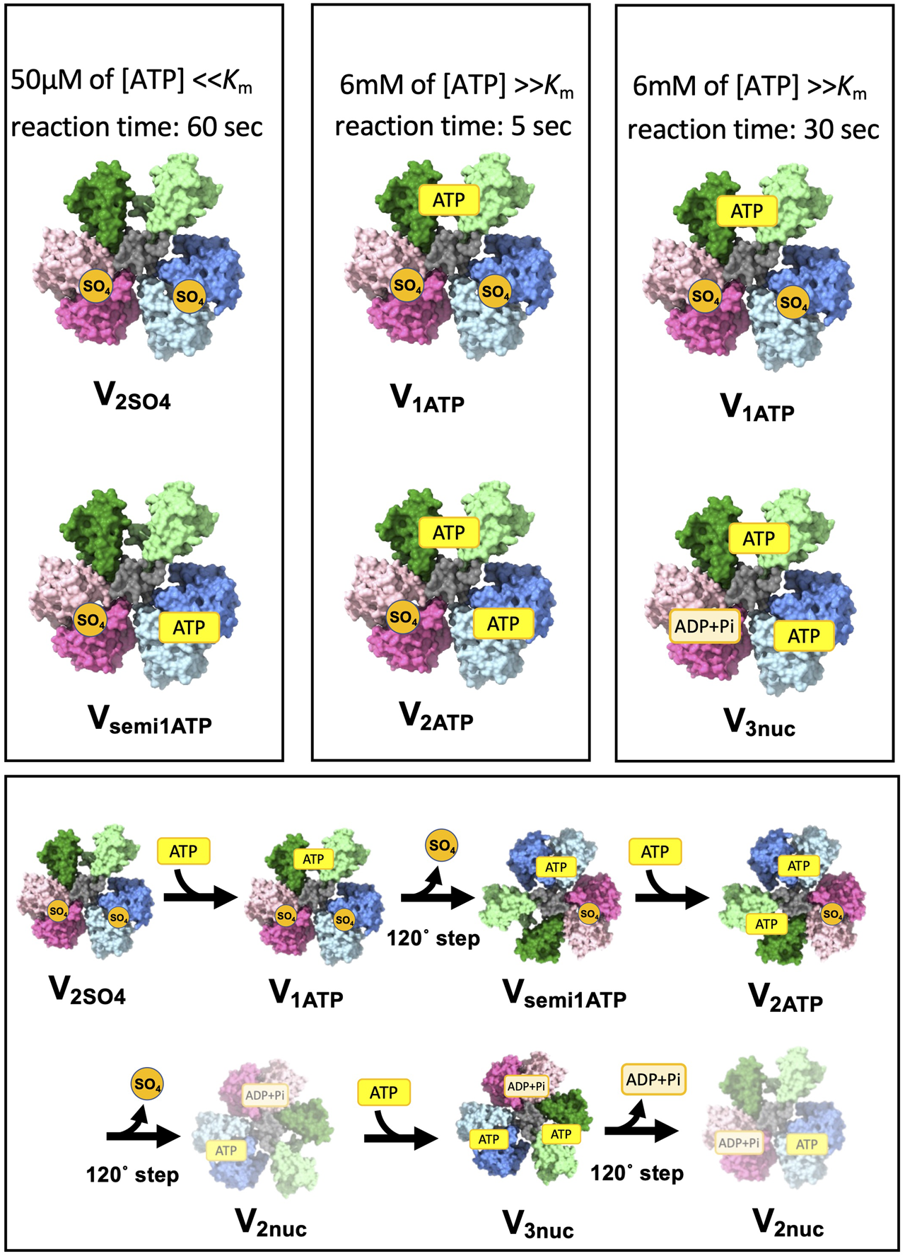 The transition process from the initial state of V1 to the V3nuc is shown in Figure 5D. When ATP binds to V2SO4, it changes to V1ATP. Upon ATP binding to ABopen, resulting in a 120° step, one molecule of SO4 is released, resulting in the transition to Vsemi1ATP. ATP binds to Vsemi1ATP to produce V2ATP. This undergoes a 120° step and releases ADP and Pi, yielding V2nuc. ATP binding to the V2nuc produces V3nuc. The initially bound SO4 is released, and V1 eventually reaches a steady state in which V2nuc and V3nuc alternately appear as a result of ATP hydrolysis.
