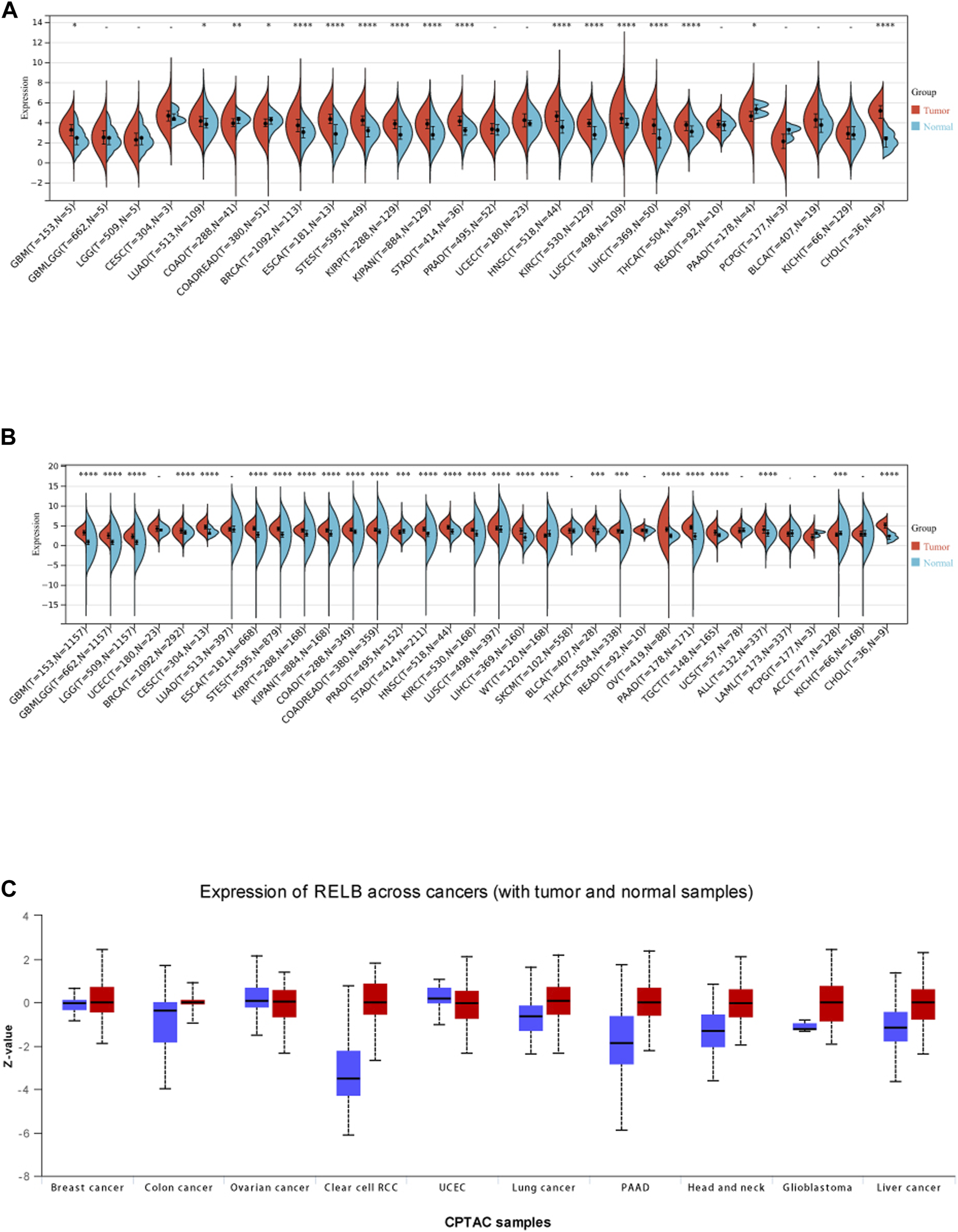 According to the analysis results of cancer data from The Cancer Genome Altas (TCGA), we observed RelB expression was significantly upregulated compared with the adjacent normal tissues in GBM, LUAD, COAD, BRCA, ESCA, STES, KIRP, KIPAN, KIRC, LIHC, STAD, HNSC, LUSC, THCA, PAAD, PRAD and CHOL (