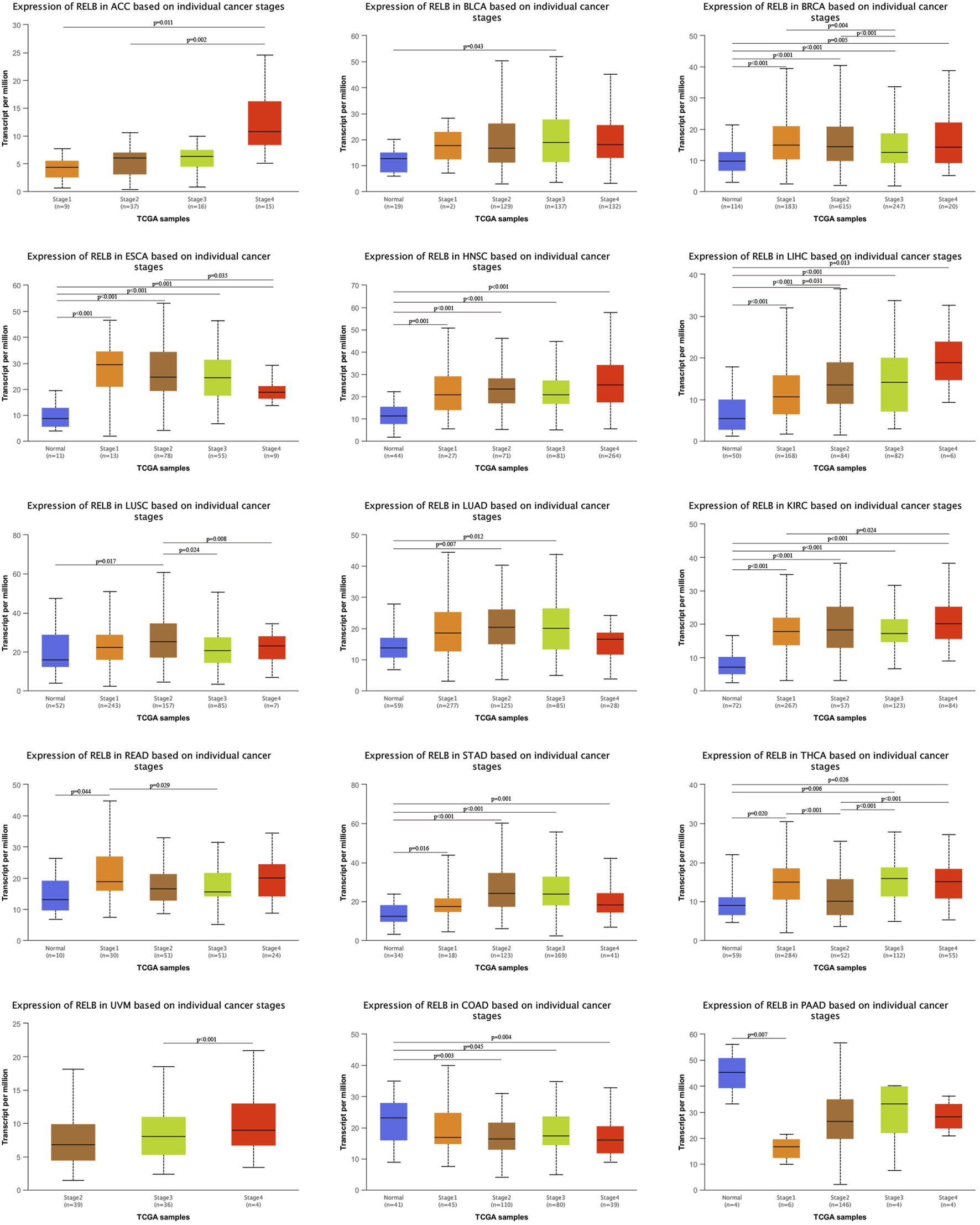 The relationship between RelB expression and clinic-pathological features in TCGA database was evaluated based on individual cancer stages. The tumors were classified into stages I, II, III, and IV according to the its clinical information. Compared with normal tissue controls, RelB expression was higher in BRCA, KIRC, ESCA, LIHC, ACC, STAD (