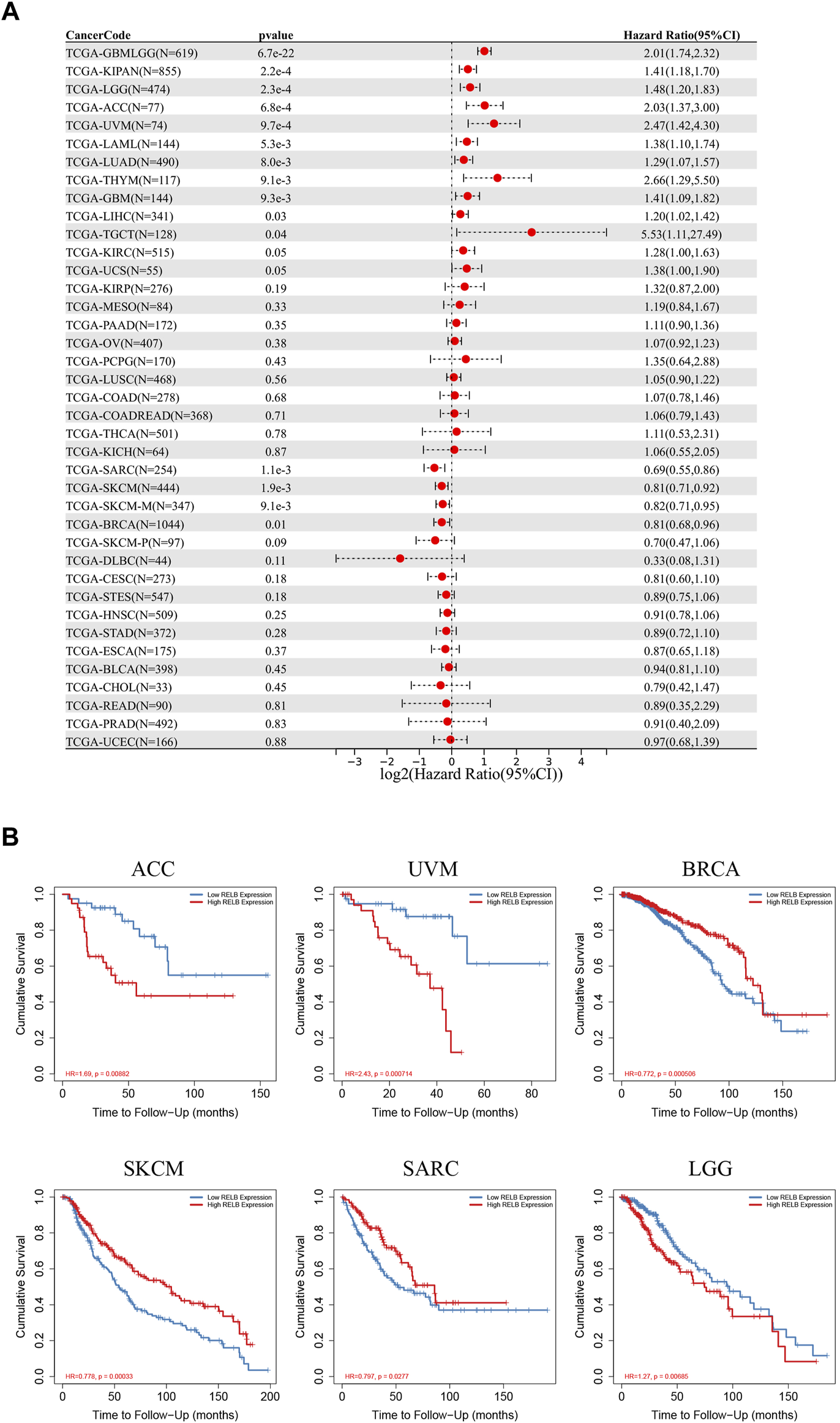 The prognostic role of RelB in human pan-cancer. (A) Relationship between RelB expression and overall survival (OS) using the Cox regression method in pan-cancer. (B) OS curves comparing high and low expression of RelB in some cancer types with Kaplan-Meier methodology in TIMER2.0 database.