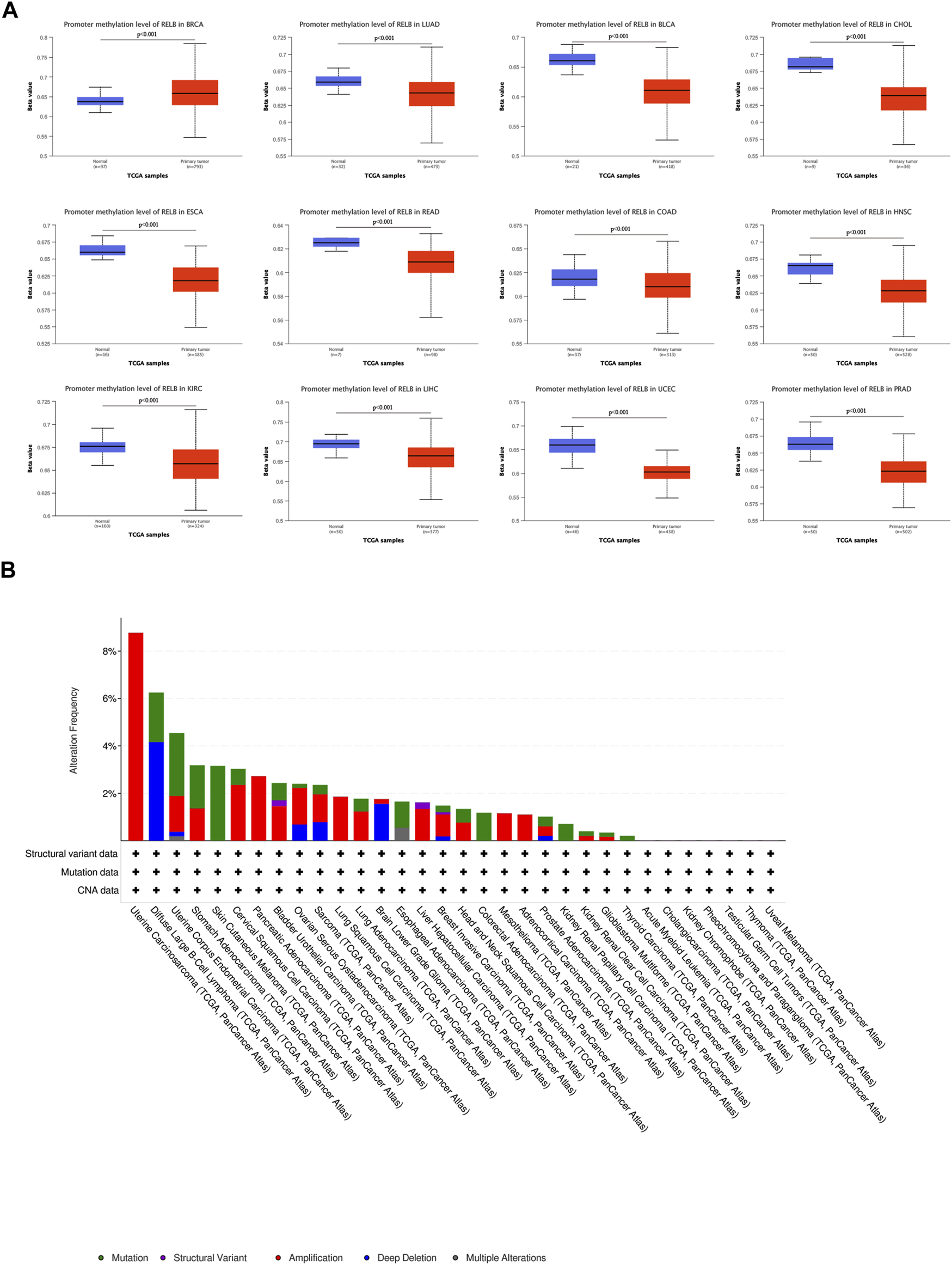 The DNA methylation and mutation profile of RelB in pan-cancer. The Beta value indicates level of DNA methylation ranging from 0 (unmethylated) to 1 (fully methylated). Different beta value cut-off has been considered to indicate hyper-methylation [Beta value: 0.5–0.7] or hypo-methylation [Beta value:0.25–0.3]. (A) The promotor methylation level of RelB in human pan-cancer was investigated based on the UALCAN database. (B) The mutation profile of RelB was explored and amplification was the major type of mutation.