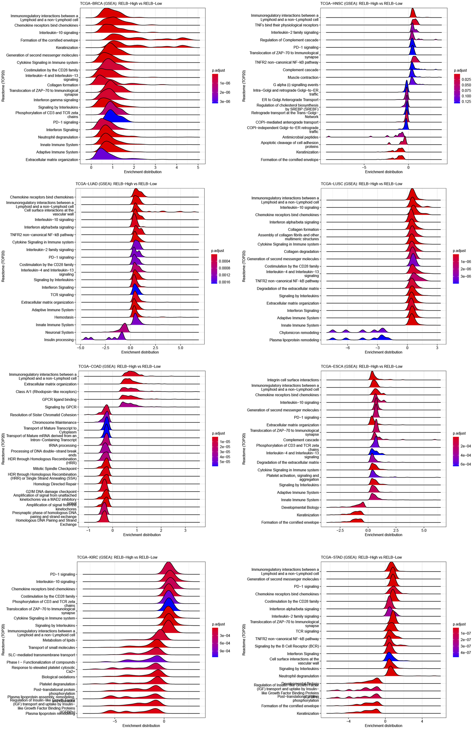 Figure 5). Most importantly, increased RelB expression level led to markedly activation of immunity-related pathways, including PD1 signaling, cytokine signaling, TCR signaling and innate and adaptive immune system. Previous studies had demonstrated that RelB was particularly essential for lymphoid organogenesis, B-cell maturation, inflammation and was engaged in modulating tumor immunization (