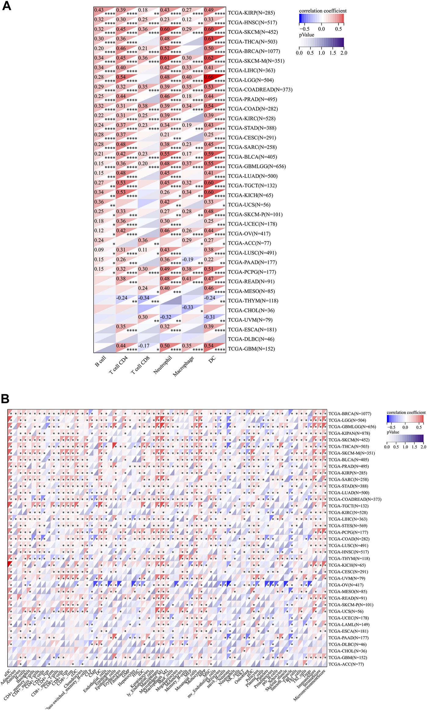 Relationship between RelB expression and the immune cell infiltration level in human pan-cancer; (A) Heatmap of correlations of the expression of RelB and the immune infiltration level in all types of human cancer using TIMER database. (B) Heatmap of correlations between the expression of RelB and the infiltrated cells in human cancers using xCell. *p < 0.05; **p < 0.01; ***p < 0.001.