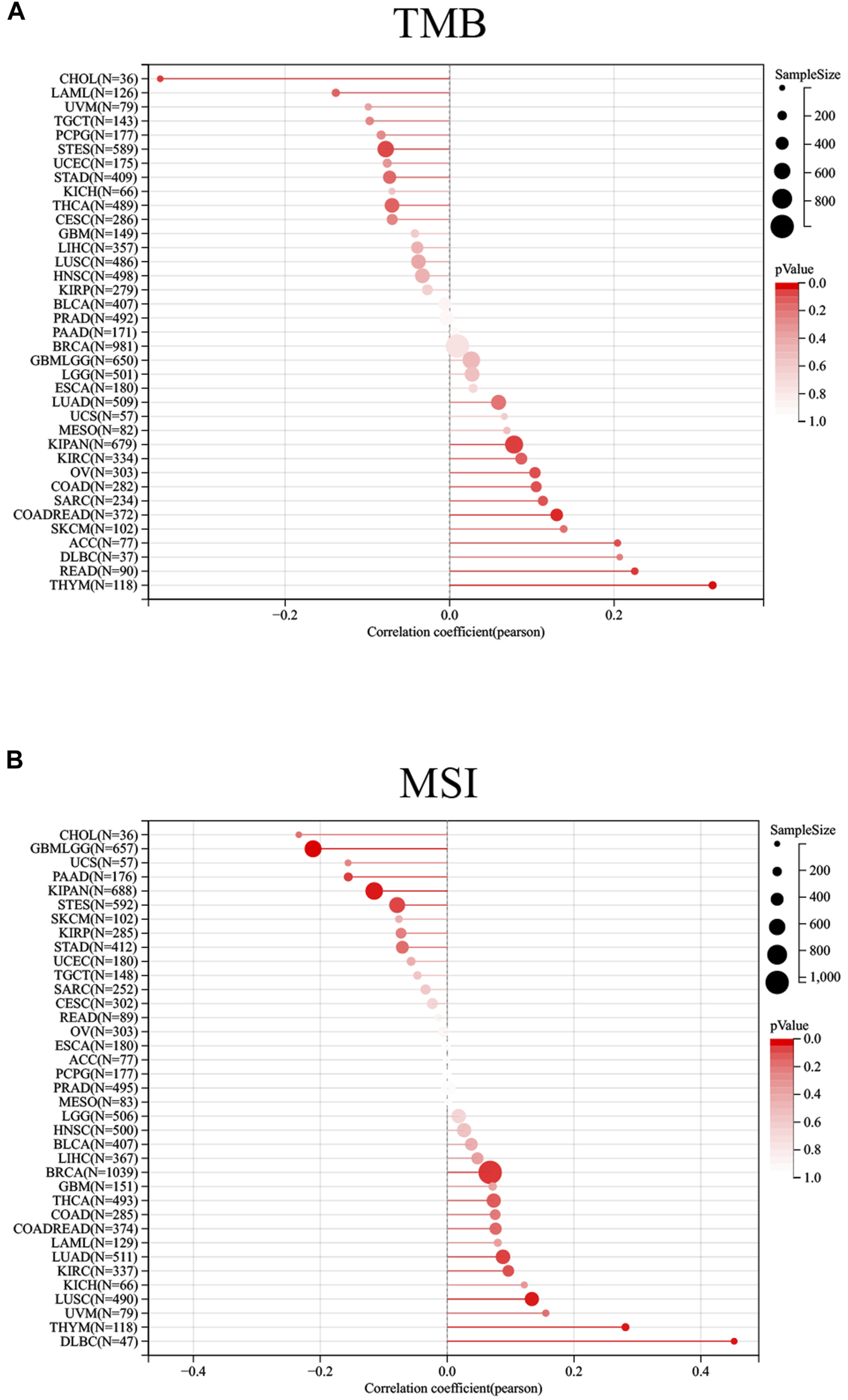 Relationship between RelB expression and TMB and MSI; Correlation of RelB expression with TMB, MSI in human pan-cancer was shown in the lollipop graph (A) and (B).