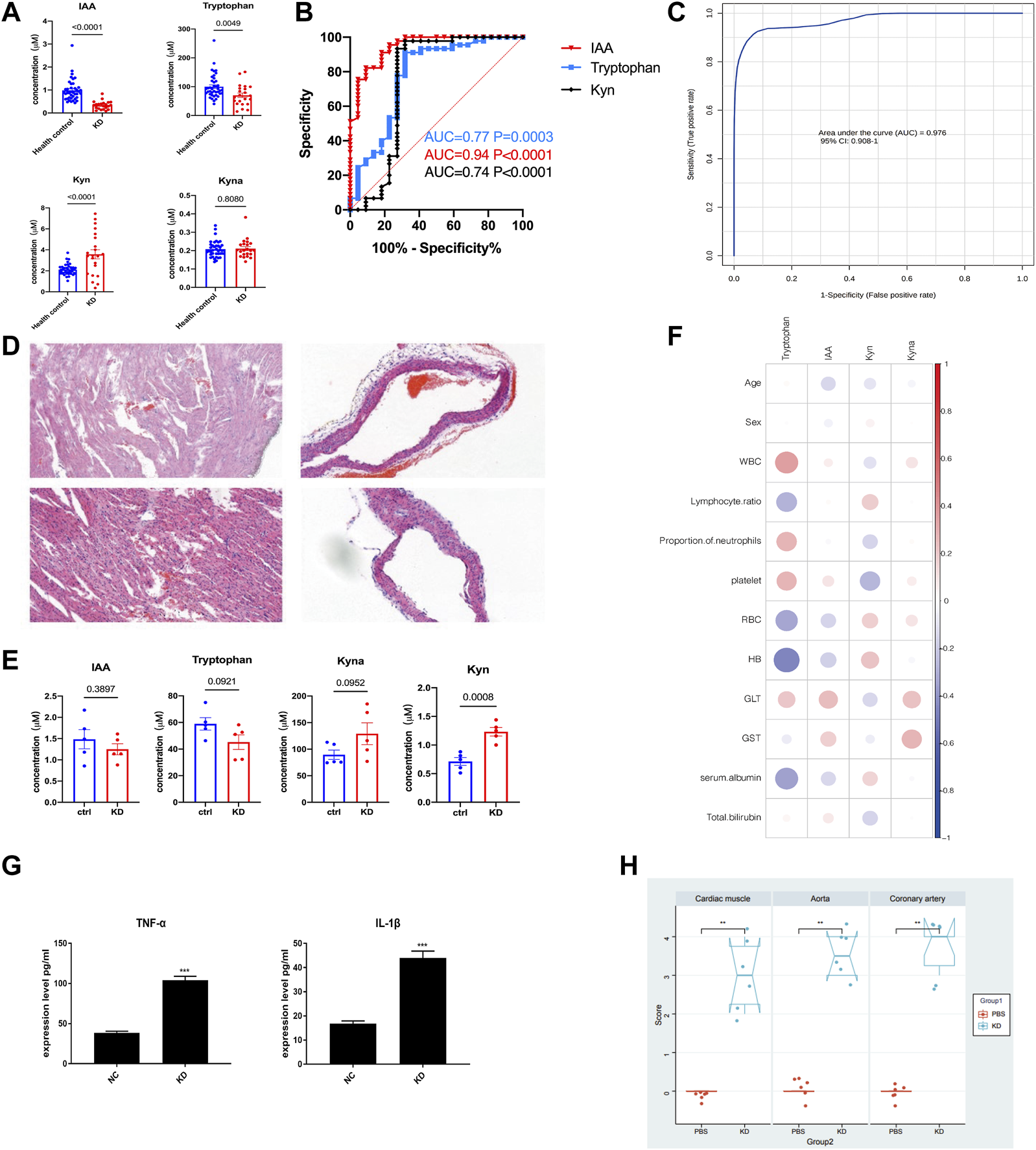 The LCWE mouse model and internal validation of metabolic alterations in patients with KD. Bar plots showing the serum levels of Trp-related metabolites in the discovery cohort (HC, n = 40; KD, n = 22) (A). Receiver operating characteristic (ROC) curve showing the discrimination accuracy of the three metabolites in the discovery cohort (B). ROC analysis incorporating indole acetic acid (IAA), Trp, l-kynurenine (Kyn), and kynurenic acid (Kyna) (C). Hematoxylin and eosin (HE) staining of myocardial tissue of the KD mouse model compared with that of the controls (D). Serum levels of IAA, Trp, Kyn, and Kyna in the KD mouse model (E). Correlation coefficients between serum metabolite levels and clinical characteristics in the validation cohort (F). Data were analyzed using Spearman’s rank correlation test. Levels of the pro-inflammatory cytokines, tumor necrosis factor (TNF)-α and interleukin (IL)-1β, in the serum of the LCWE mouse model (G). Myocardial inflammation and heart vessel inflammation scores for each group (H). Data are represented as the mean ± SE. Statistical analysis was performed using two-tailed Student’s t-tests (A, E, (G) and two-tailed Mann–Whitney U-tests (H). CI, confidence interval. *, p < 0.05; **, p < 0.01; ***, p < 0.001.