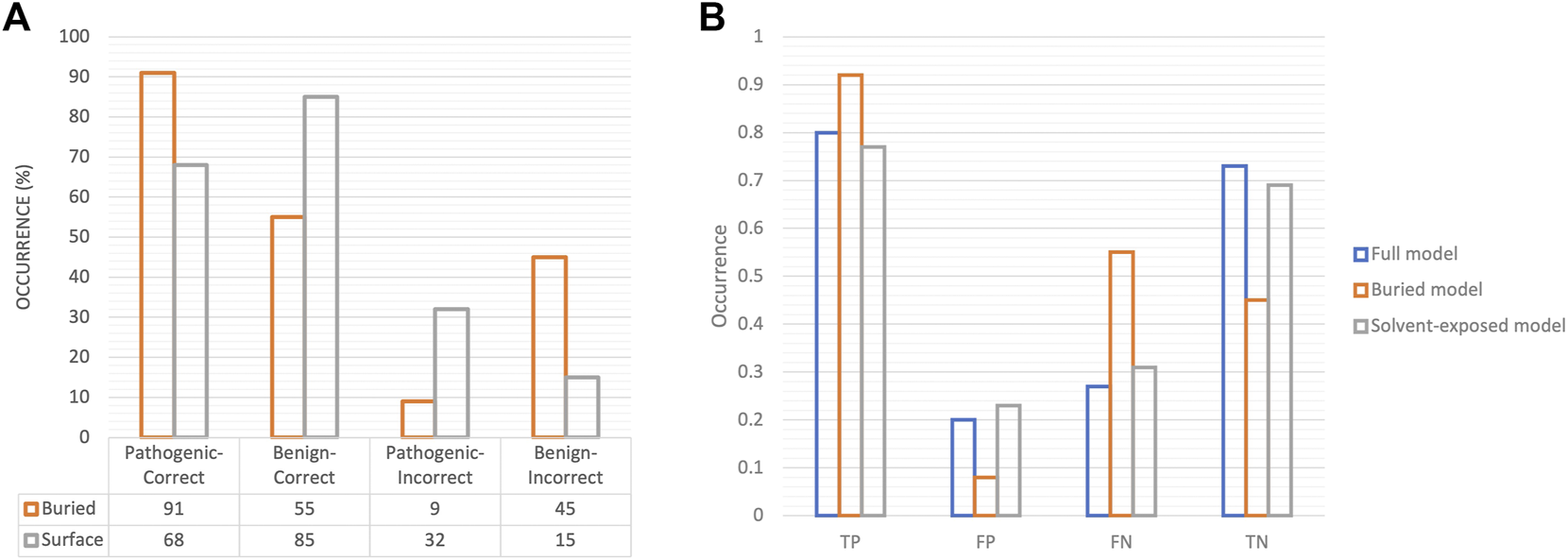 Association of solvent accessibility of variants in prediction outcomes. (A) Bar charts for correctly classified and misclassified variants with respect to their solvent accessibility are shown. (B) The performance metrics on test data in terms of TP, FP, FN, TN are depicted as bar charts for models trained on all variants (full model), on only buried variants (buried model) and on solvent-exposed variants alone (solvent-exposed model). The proportion of true positives, i.e., pathogenic variants in the model trained on buried variants is notably high.