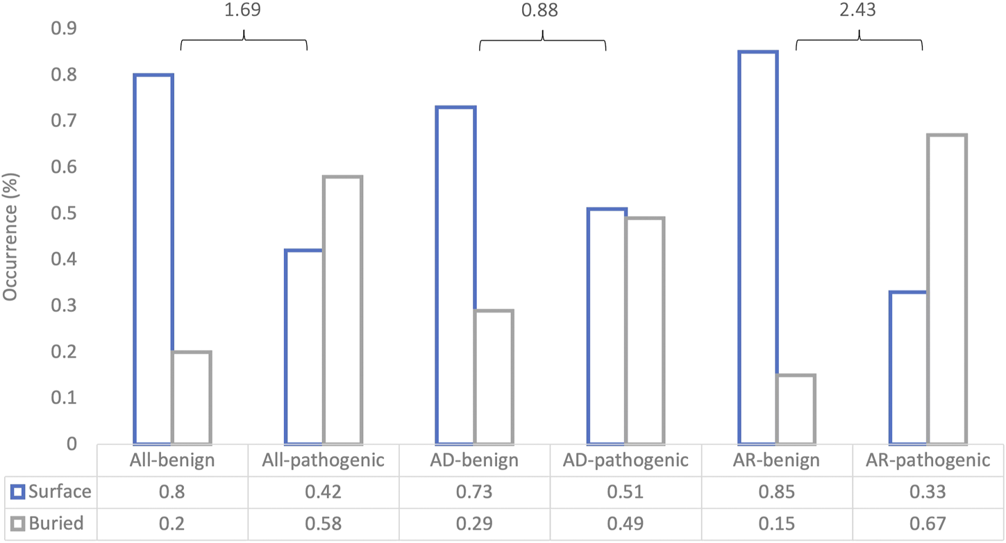 We examined our model’s predictive ability by analyzing missense variants in the test-set that were consistently predicted incorrectly across all 10 folds. We explored the aspects that promoted incorrect classification. A total of 2,883 missense variants were found to be incorrectly classified across the cross-validation experiments, of which more than half (1,732) consisted of misclassified pathogenic variants. We computed relative solvent accessibilities (RSA) for each variant residue, by dividing their absolute solvent accessibilities in Å2 by their maximum allowed solvent accessibilities obtained from Rost and Sander (Rost and Sander, 1994). Residues were categorized as solvent-exposed if the RSA values were >20% and buried if below 20%. Using these a substantial proportion of the misclassified pathogenic variants was found to be solvent-exposed (Supplementary Table S2).