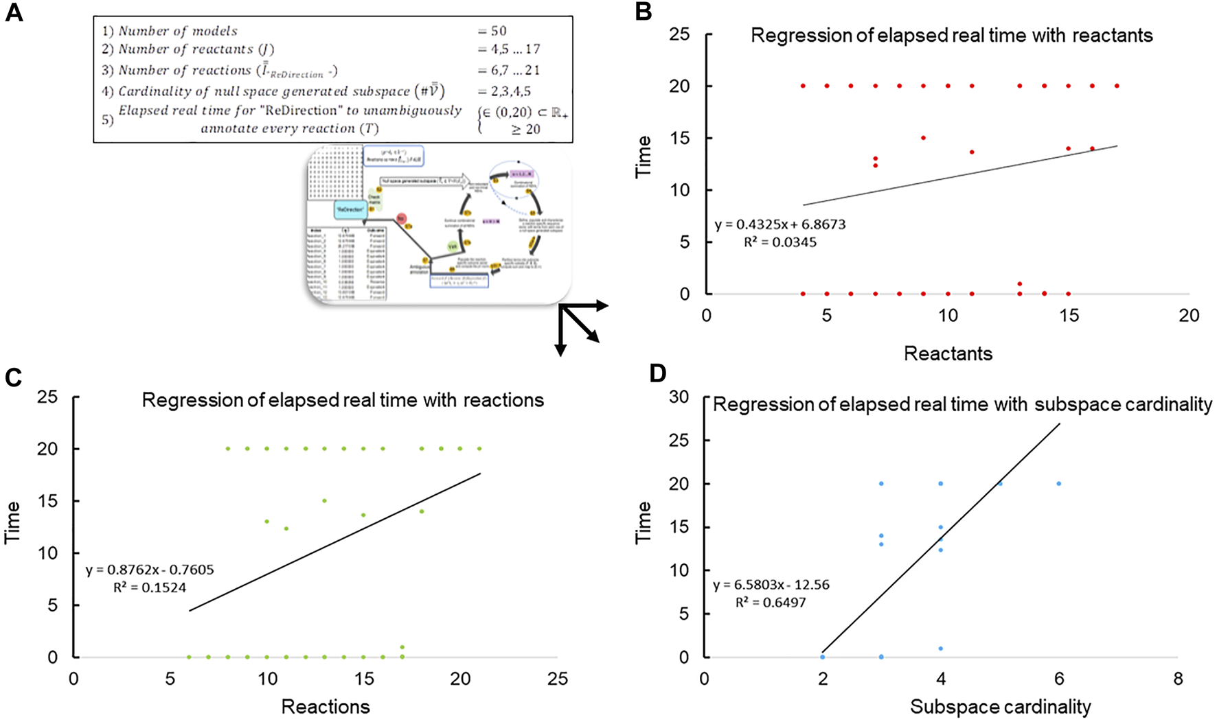 Regression of elapsed real time with network-specific parameters. (A) The data, i.e., elapsed run-time () from several observations (), are plotted against the network-specific parameters of reactant number, reaction number, and the cardinality of the reaction-specific null space-generated subspace chosen by “ReDirection” to compute the probable dissociation constant for a reaction. The scatter plot data are modeled with a specific linear regression equation, and the relevant coefficient of differentiation () is highlighted; (B) scatter diagram of the run time that elapses when “ReDirection” attempts to unambiguously annotate every reaction of a simulated biochemical network with the number of reactants/products that participate in the network; (C) scatter diagram of the run time that elapses when “ReDirection” attempts to unambiguously annotate every reaction of a simulated biochemical network with the number of reactions that participate in the network; and (D) scatter diagram of the run time that elapses when “ReDirection” attempts to unambiguously annotate every reaction of a simulated biochemical network with the cardinality of a reaction-specific null space-generated subspace that is chosen by “ReDirection” to compute the probable dissociation constant for a reaction.