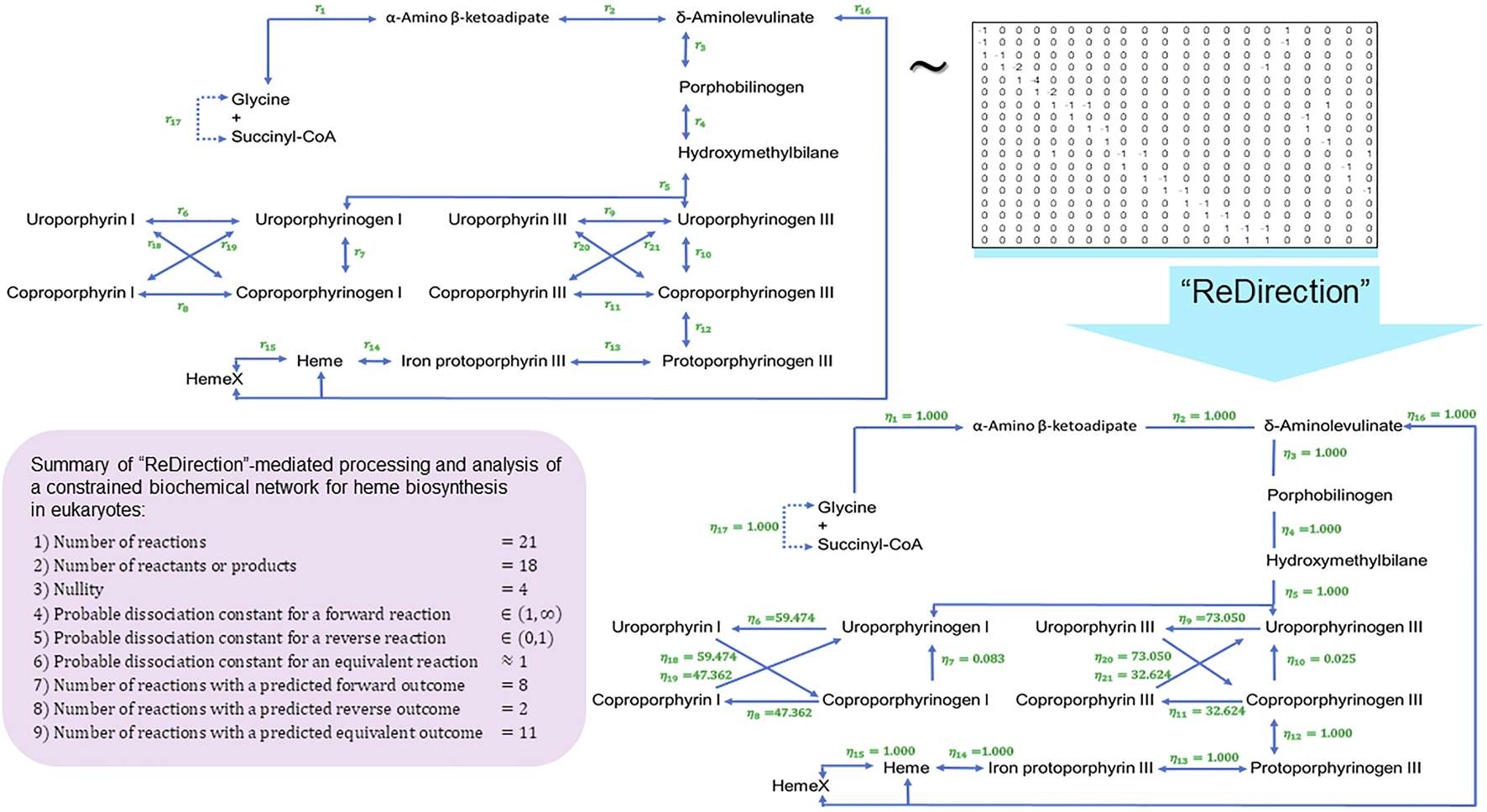 It is clear that the final list of reactions that “ReDirection” considers is only half of what may have originally been entered by the user, ; Eq. (22), for the complete biochemical network,