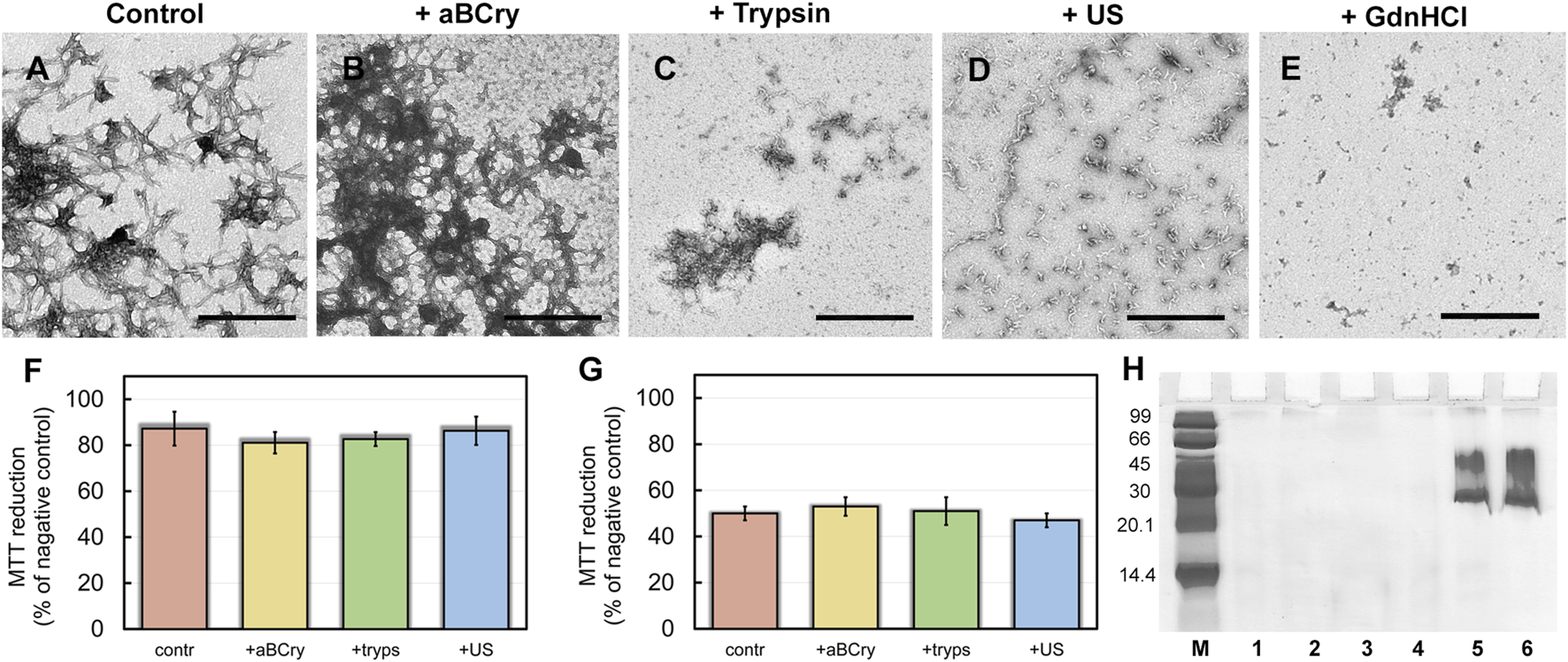 FIGURE 5. Aβ42 amyloid fibrils degradation. The electron micrographs of Aβ42 aggregates (A) before and (B–E) after their treatment by (B) aBCry, (C) trypsin, (D) ultrasound, and (E) GdnHCl. The scale bars are equal to 500 nm. (F,G) Inhibition effect of Aβ42 amyloids on HeLa cells determined by MTT assay. Cells were exposed to aggregates, intact (contr) and after their treatment by aBCry, trypsin (tryps), and ultrasound (US) at concentrations (F) 0.015 and (G) 0.075 μM. Data are expressed as mean ± SEM based on triplicate samples. (H) Native PAGE (17% gel) of Aβ42 aggregates before (lane 1) and after their treatment by trypsin (lane 2), GdnHCl (lane 3), ultrasound (lane 4), and aBCry (lane 5). (lane 6) corresponds to aBCry alone. (M) corresponds to marker proteins.