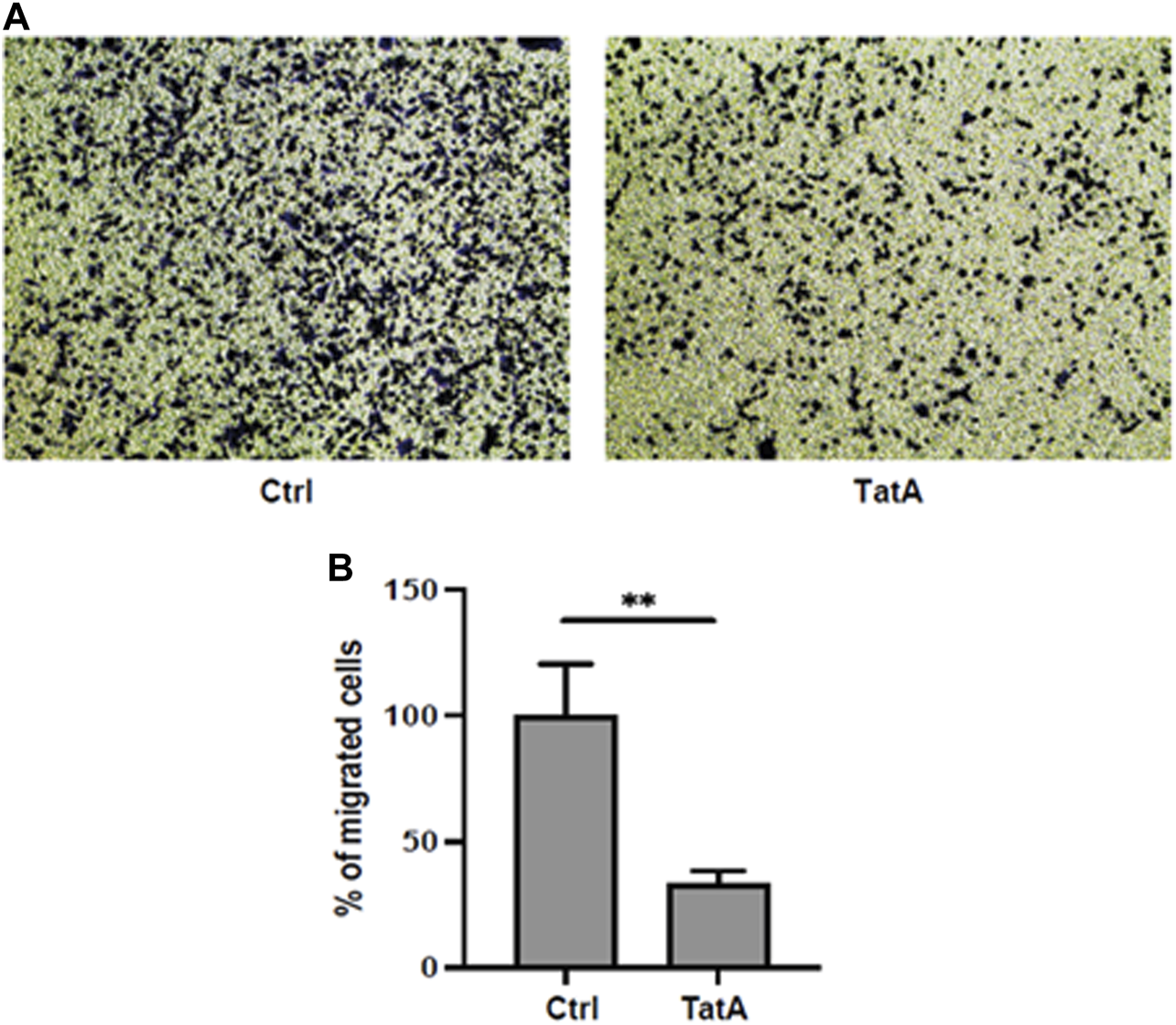 (A) Representative microscopic images of the bottom surface of Transwell filters stained with crystal violet (magnification ×10) showing KATO III cells treated with or without 100 μM TatA for 24 h. (B) Quantification of invasive cells. The data are shown as the mean number of cells per eight visual fields (magnification ×10) of three replicate wells ± s.d. (t-test; **p-value ≤0.01).