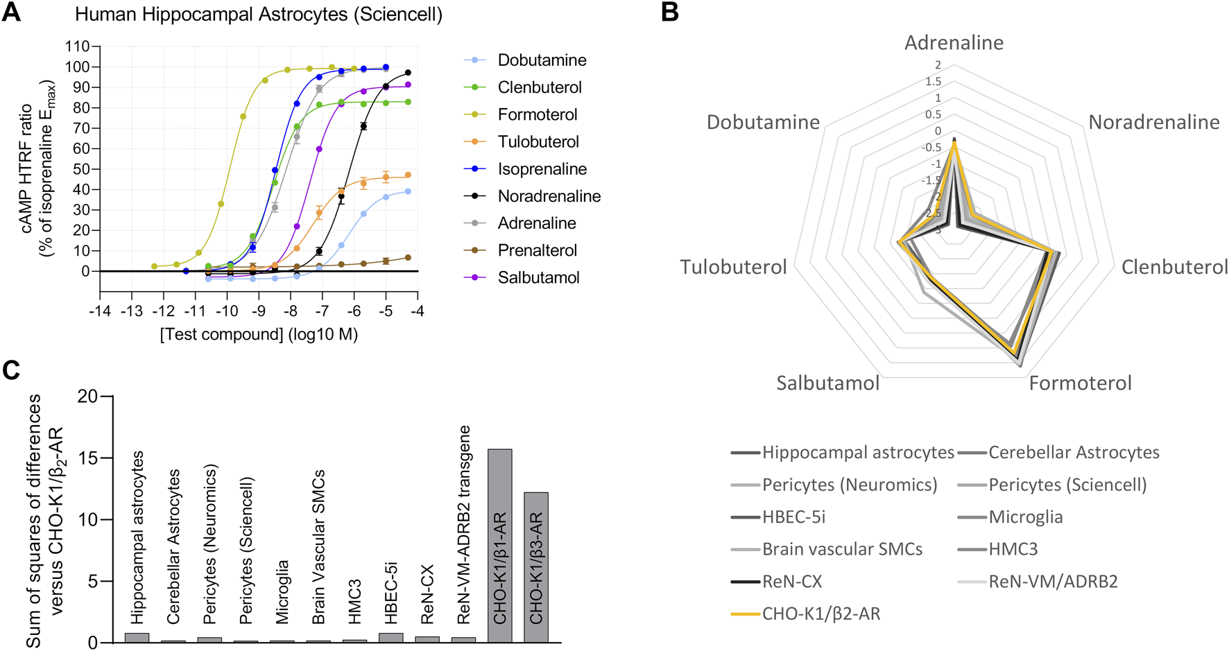 Human brain-derived cells display predominantly β2-AR activity. (A) Functional cAMP responses to a panel of β-AR agonists in primary human hippocampal astrocytes, a representative concentration–response curve from examination of several types of brain-derived human primary cells and cell lines. Representative curves are displayed, each with four technical replicates, showing mean ± SEM cAMP HTRF responses normalized to the full agonist isoprenaline. (B) The human brain cells tested have agonist fingerprints like those of recombinant CHO-K1/β2-AR cells, suggestive of predominantly β2-AR endogenous function. (C) Similarity of each agonist fingerprint to the CHO-K1/β2-AR system by summing the squares of differences for each agonist Δlog(Emax/EC50) value.