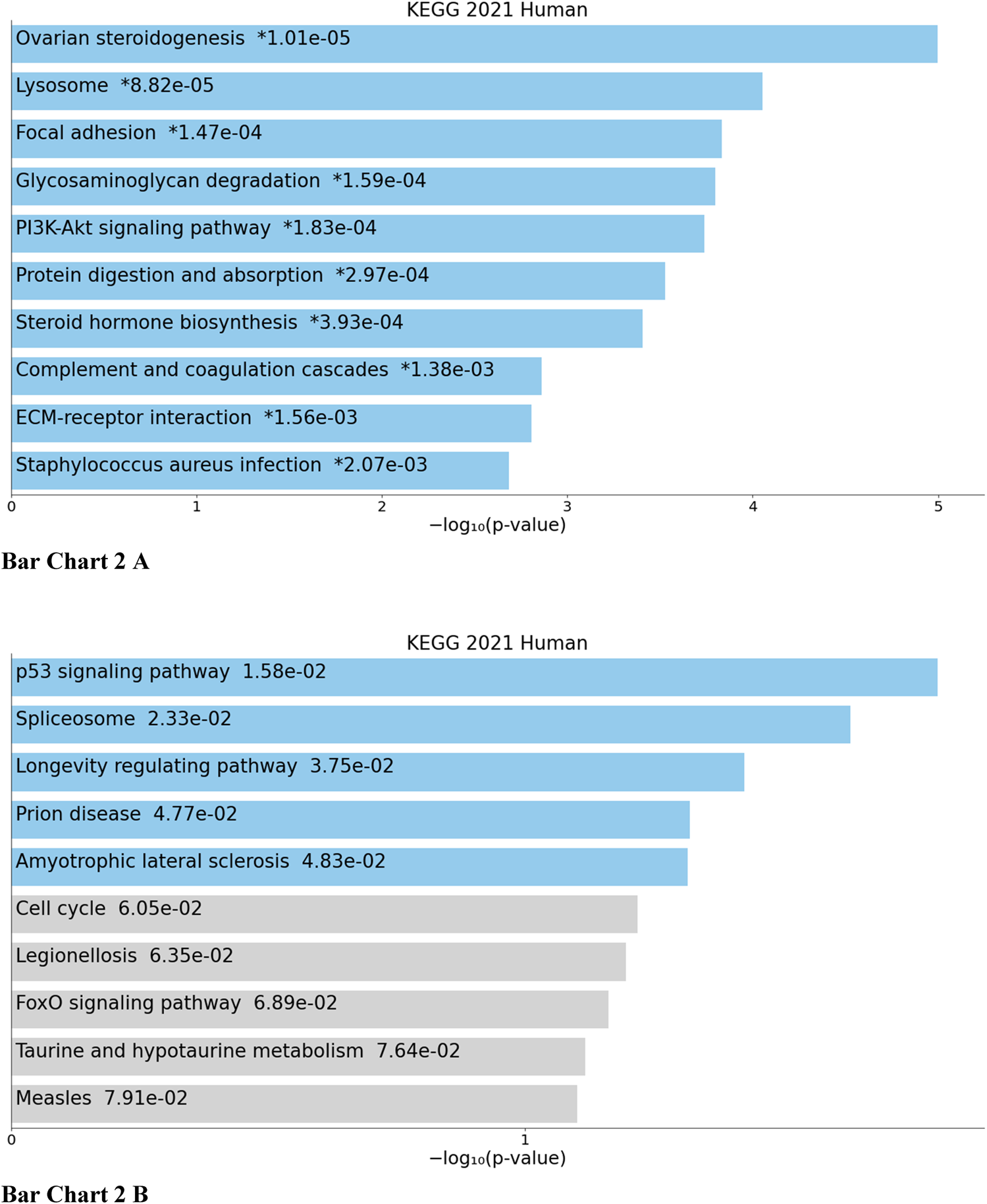 BAR GRAPH 2. Gene set enrichment analysis of common down-regulated and up-regulated genes across all four studies using KEGG pathway functional annotation [(A) up-regulated, (B) down-regulated].