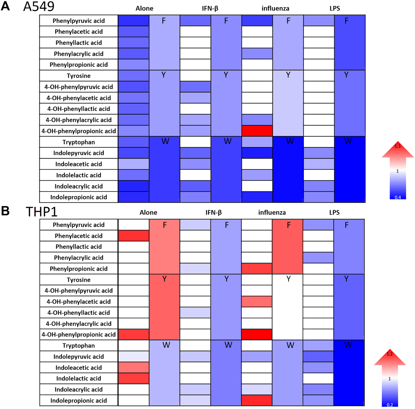 Aromatic amino acid metabolites modulate IFN signaling in human lung epithelial cells and monocytes. Heatmaps depicting fold change in IFN reporter activity in A549 (A) and THP1 cells (B) treated with airomatic amino acid metabolites (numbered 2–18) individually and in family combinations (F, Y, W) alone and with IFN-β (10 U/mL), influenza (MOI-1) or LPS (5 ng/mL) for 24 h. DMSO served as the control for the metabolites. (n = 5 experiments: 23 biological and 23 technical replicates for A549 individual metabolites alone and n = 3 experiments: 11 biological and 11 technical replicates for THP1 individual metabolites alone; n = 3 experiments: 11 biological and 11 technical replicates for A549 and THP1 with IFN-β and individual metabolites; n = 3 experiments: 11–15 biological and technical replicates for A549 with IFN-β and n = 3 experiments: 11–15 biological and technical replicates for THP1 with influenza and individual metabolites; n = 3 experiments: 11 biological and 11 technical replicates for A549 and THP1 with LPS and individual metabolites; n = 3 experiments: 6–24 biological and technical replicates for A549 alone with metabolite family combinations; n = 3 experiments: 12–20 biological and technical replicates for THP1 alone with metabolite family combinations; n = 3 experiments: 15 biological and technical replicates for A549 with IFN-, 14 biological and technical replicates for A549 with influenza, 12 biological and technical replicates for A549 with LPS and metabolite family combinations; n = 3 experiments: 9 biological and technical replicates for THP1 with IFN-β, influenza or LPS along with all metabolite family combinations). Mann–Whitney was used for statistical analysis. If a color is used, the comparison met statistical significance at p < 0.05; please see Supplementary Figures S2–S5 for significance magnitude.
